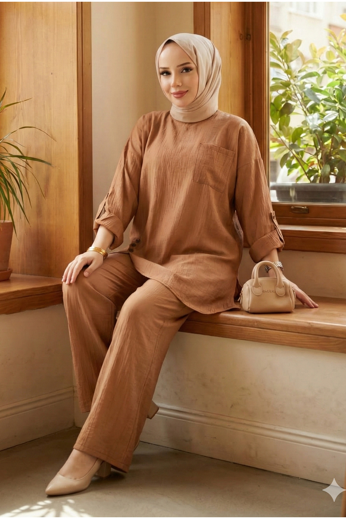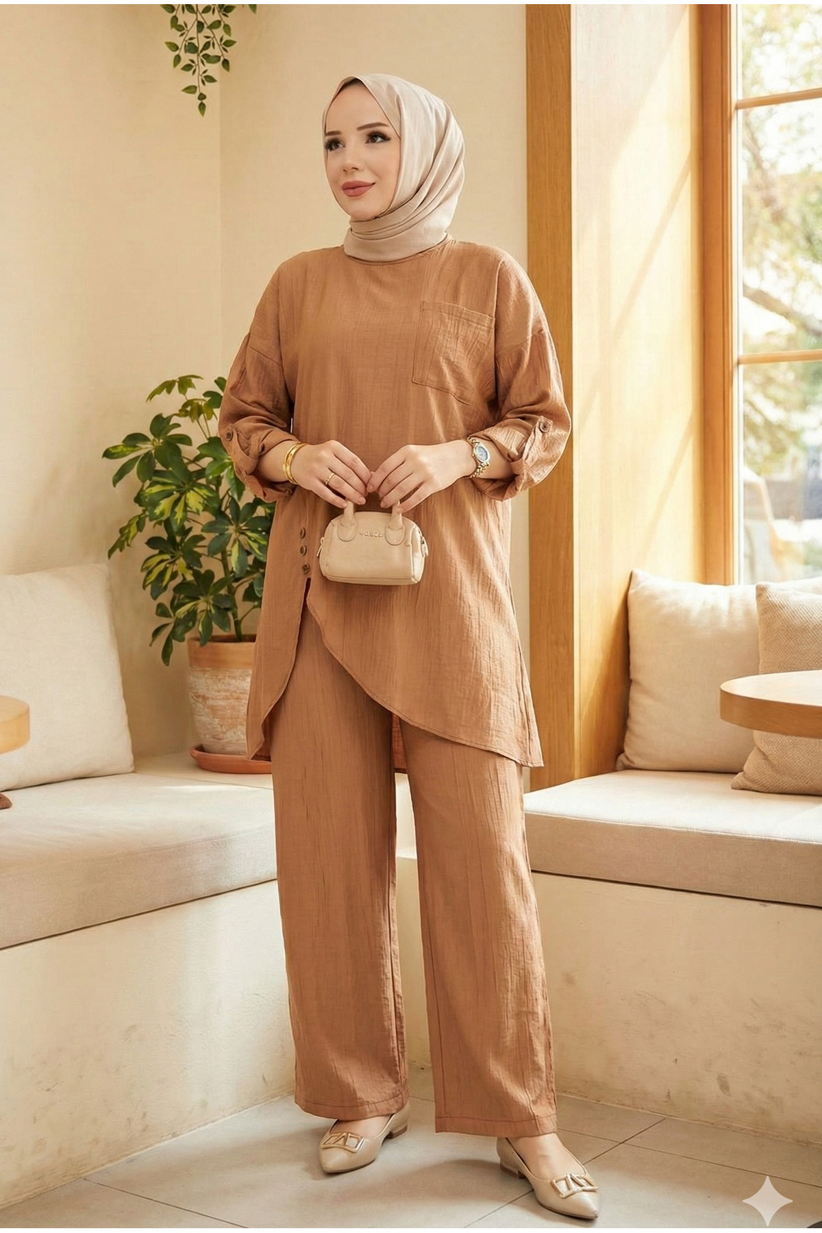 Kadın Taba Çilek Kumaş Asimetrik 2li Tesettür Tunik Pantolon Ikili Pantolonlu Takım Kadın Taba Çilek Kumaş Asimetrik 2li Tesettür Tunik Pantolon Ikili Pantolonlu Takım NECLA TAKIM 48