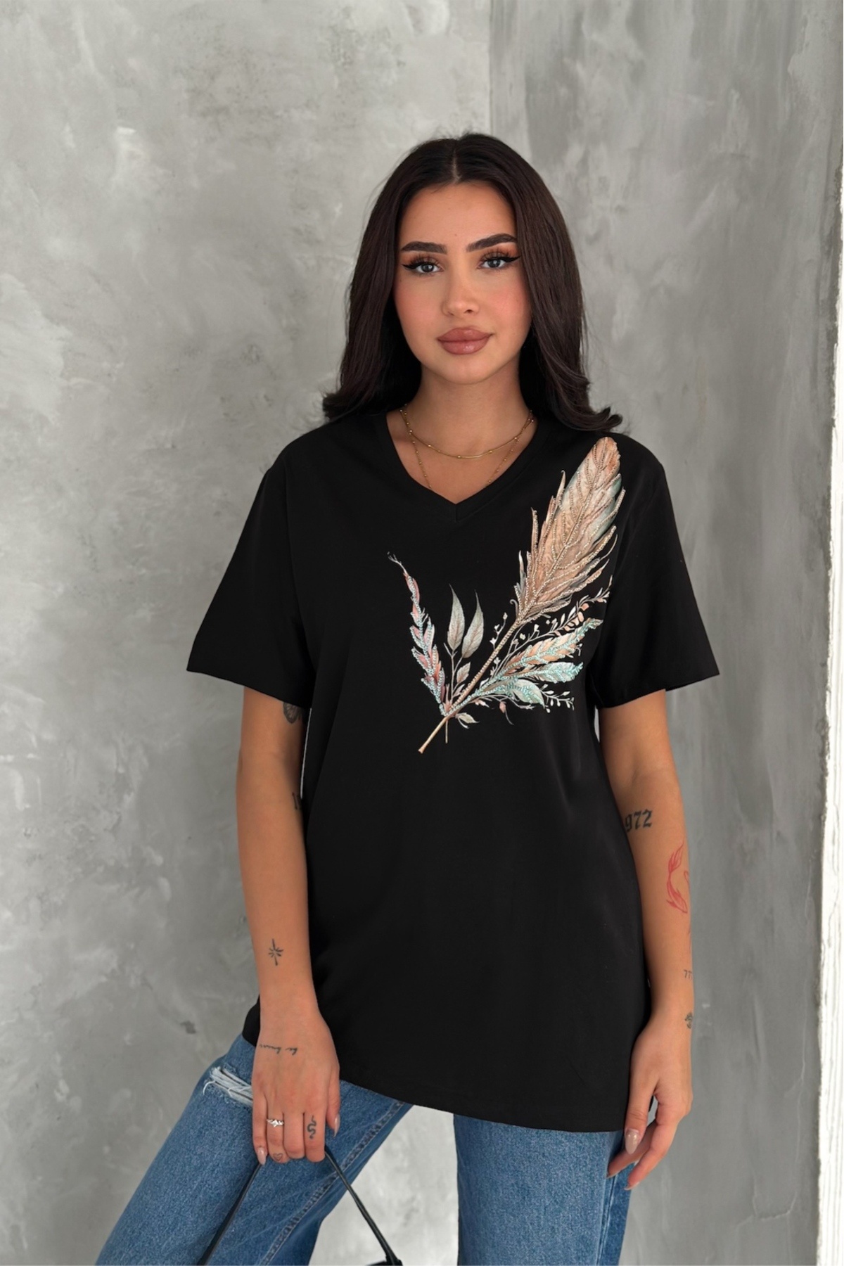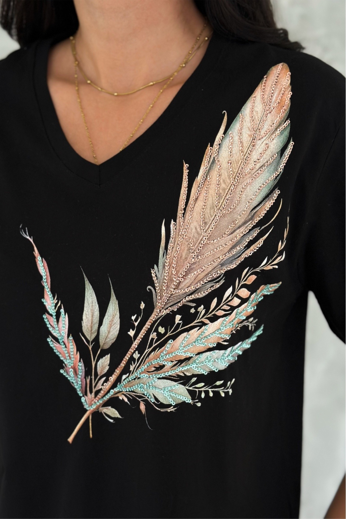 Kadın Siyah V Yaka Büyük Beden Yaprak Desen Pul Payet İşlemeli %100 Pamuk Büyük Beden Tişört Kadın Siyah V Yaka Büyük Beden Yaprak Desen Pul Payet İşlemeli %100 Pamuk Büyük Beden Tişört FEB31 3XL
