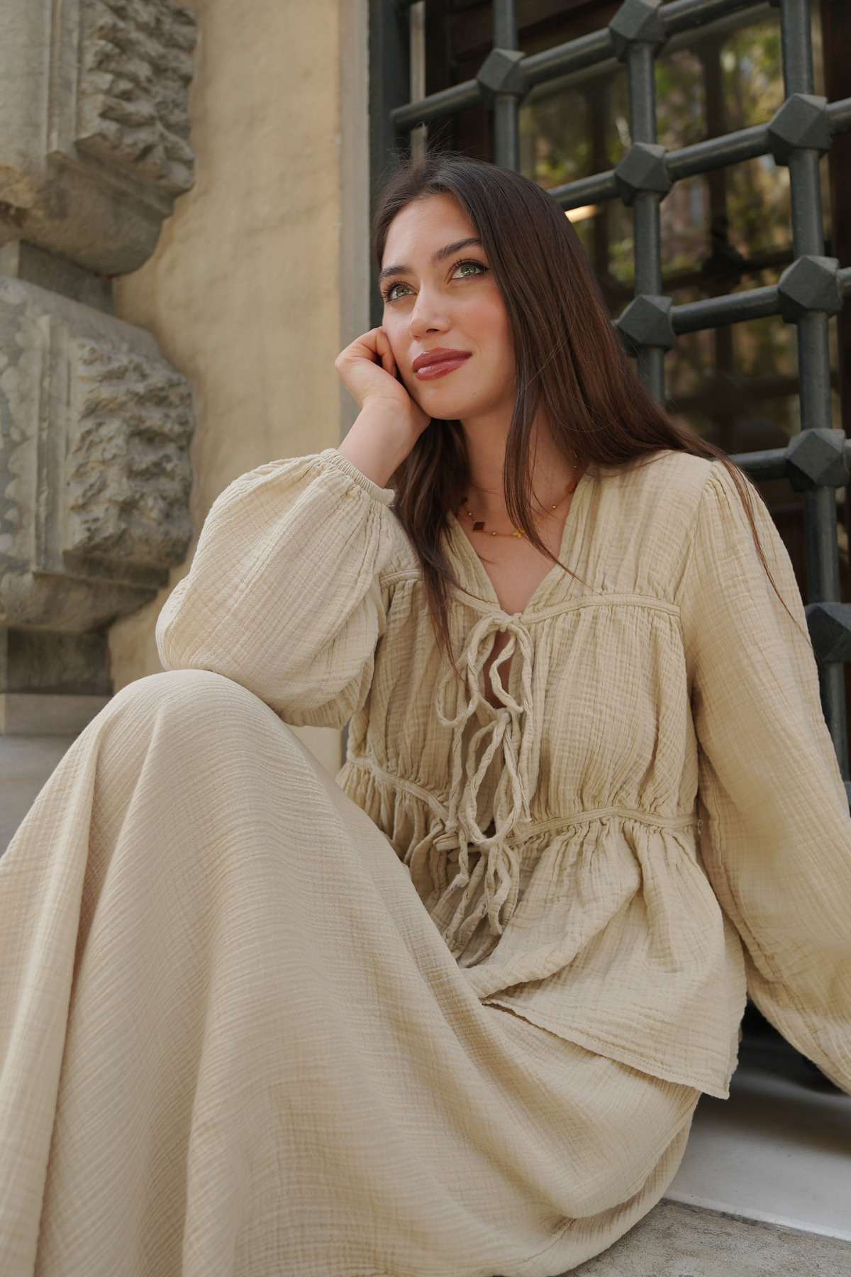 Kadın Bağcık Detaylı Yıkanmış Yumuşak Pamuk Muslin Bluz Kadın Bağcık Detaylı Yıkanmış Yumuşak Pamuk Muslin Bluz 2513051652 L/XL