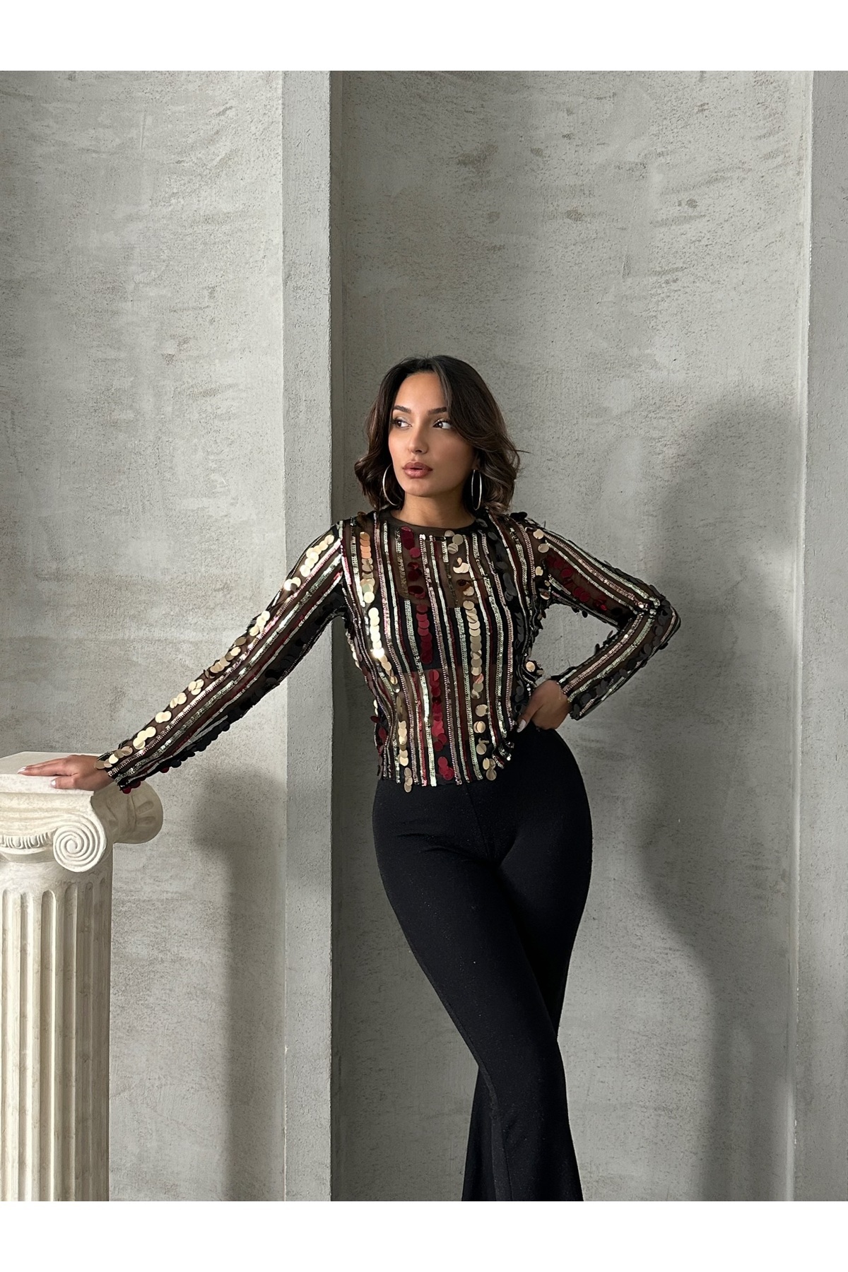 Kadın Renkli Pul Payet Desenli Bisiklet Yaka Transparan Bluz Kadın Renkli Pul Payet Desenli Bisiklet Yaka Transparan Bluz F1871 M