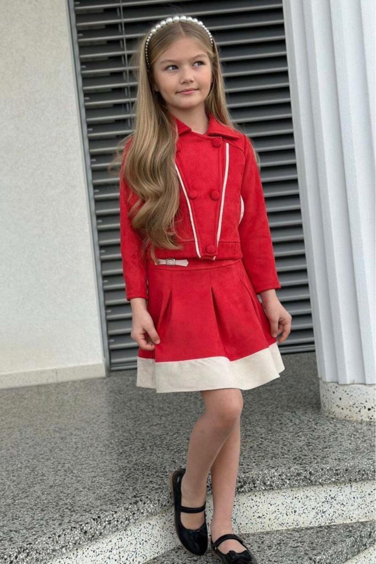 Kız Çocuk Asimetrik Kesim Gömlek Yaka Ceket Eteği Şerit Detaylı Pliseli Süet Haki Etekli Takım Kız Çocuk Asimetrik Kesim Gömlek Yaka Ceket Eteği Şerit Detaylı Pliseli Süet Haki Etekli Takım 2251205010 11-12 Yaş