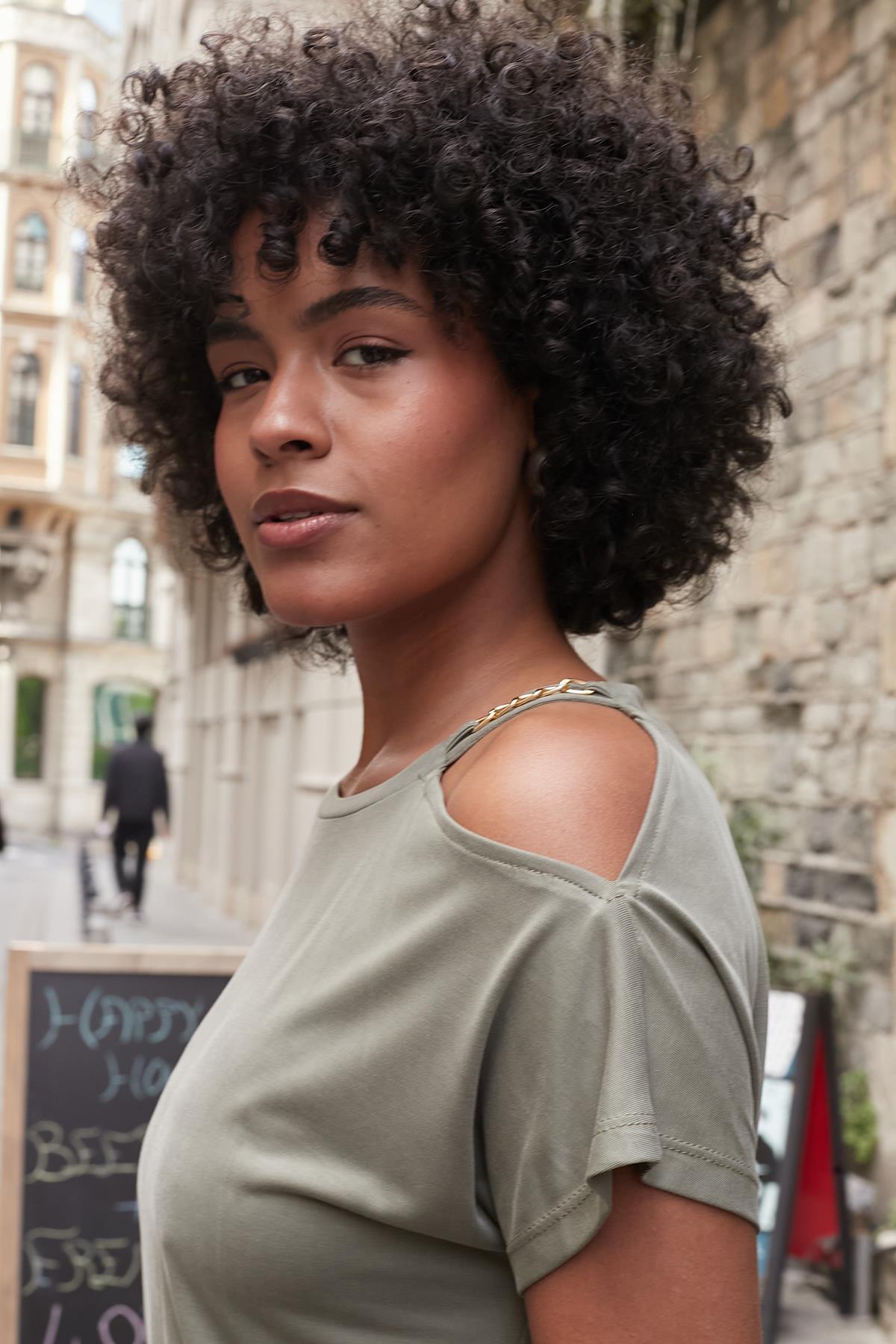 Kadın Modal Penye Geniş Sıfır Yaka Omuzu Dekolteli Aksesuarlı Düşük Omuz Bluz-Haki Kadın Modal Penye Geniş Sıfır Yaka Omuzu Dekolteli Aksesuarlı Düşük Omuz Bluz-Haki 20540 XL