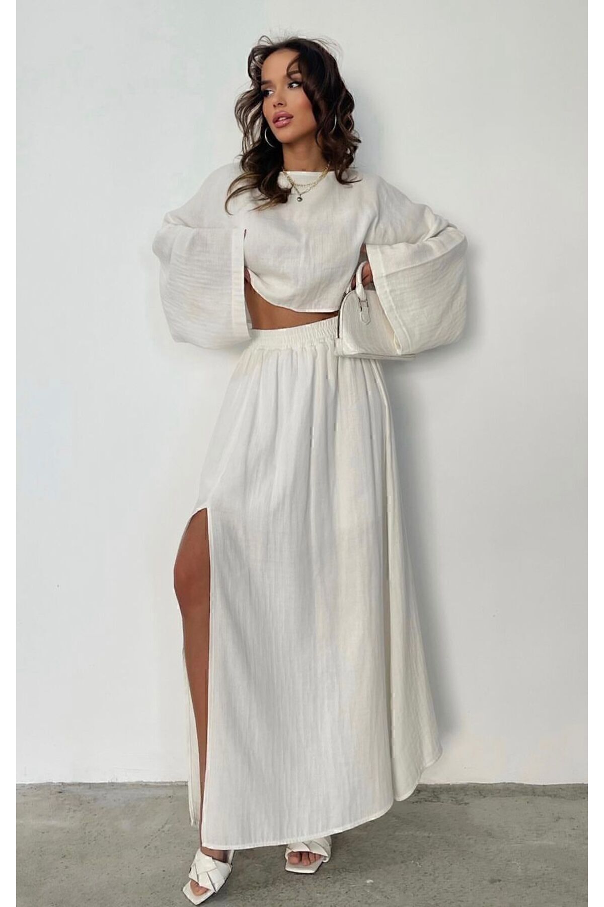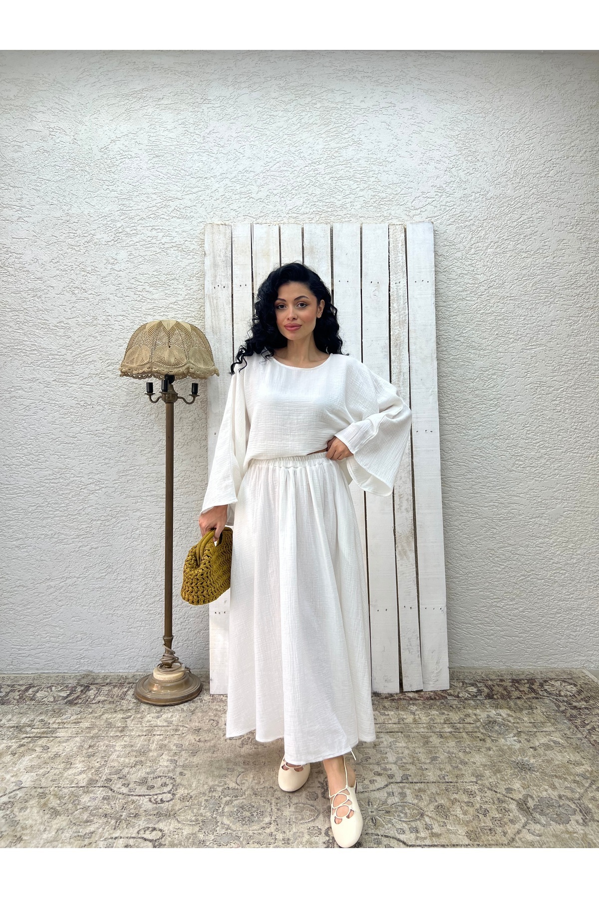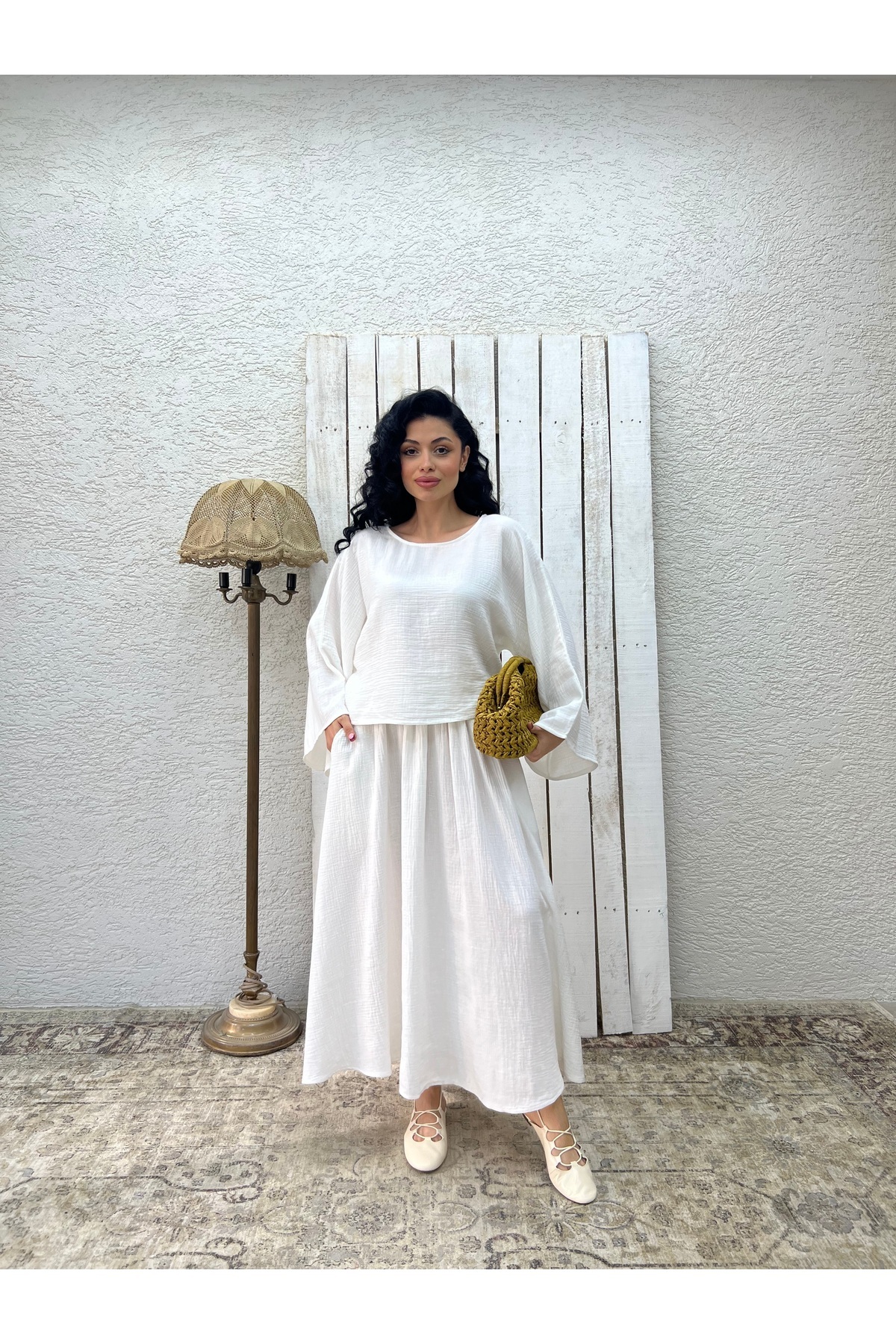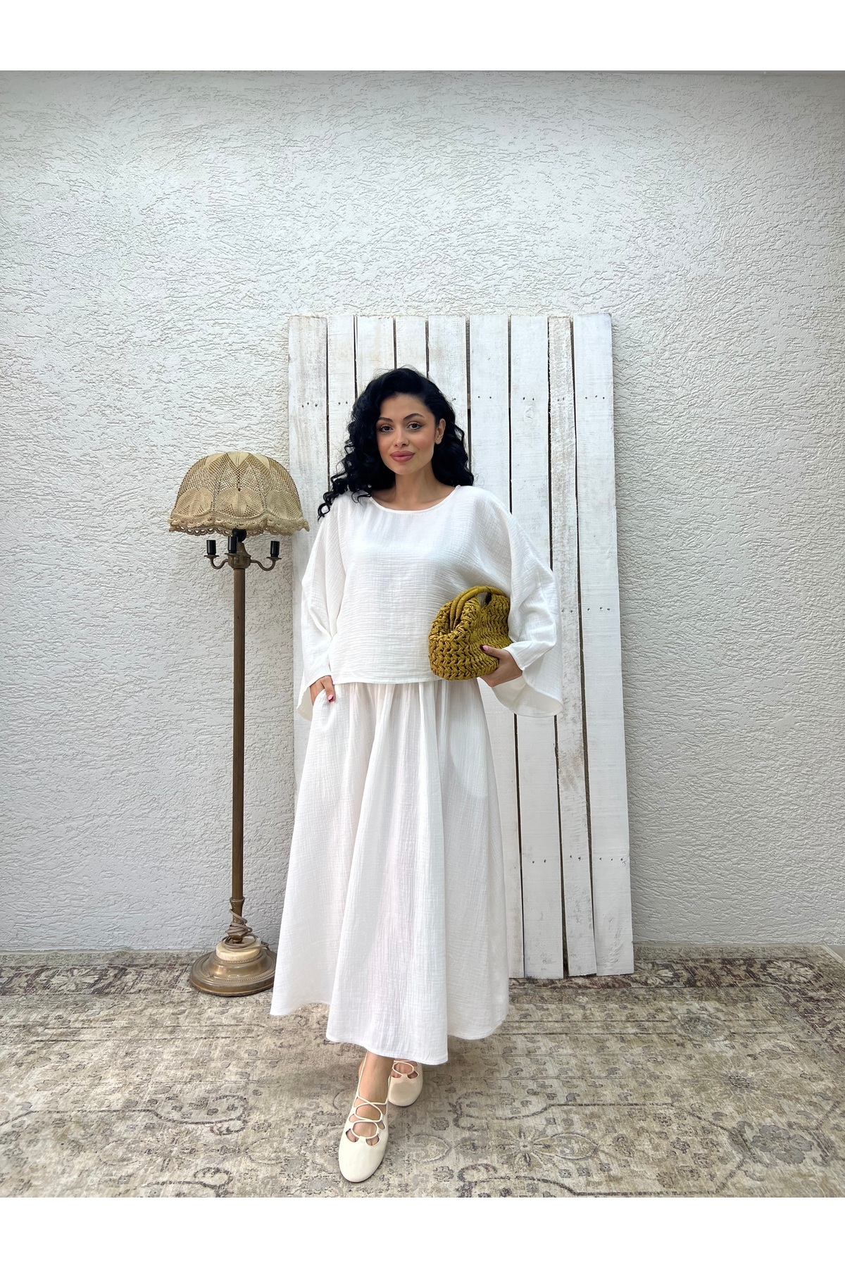 Beyaz Müslin Salaş Bluz Ve Kloş Etek Takımı (2'Lİ TAKIM) Beyaz Müslin Salaş Bluz Ve Kloş Etek Takımı (2'Lİ TAKIM) KCGM13335 L/XL