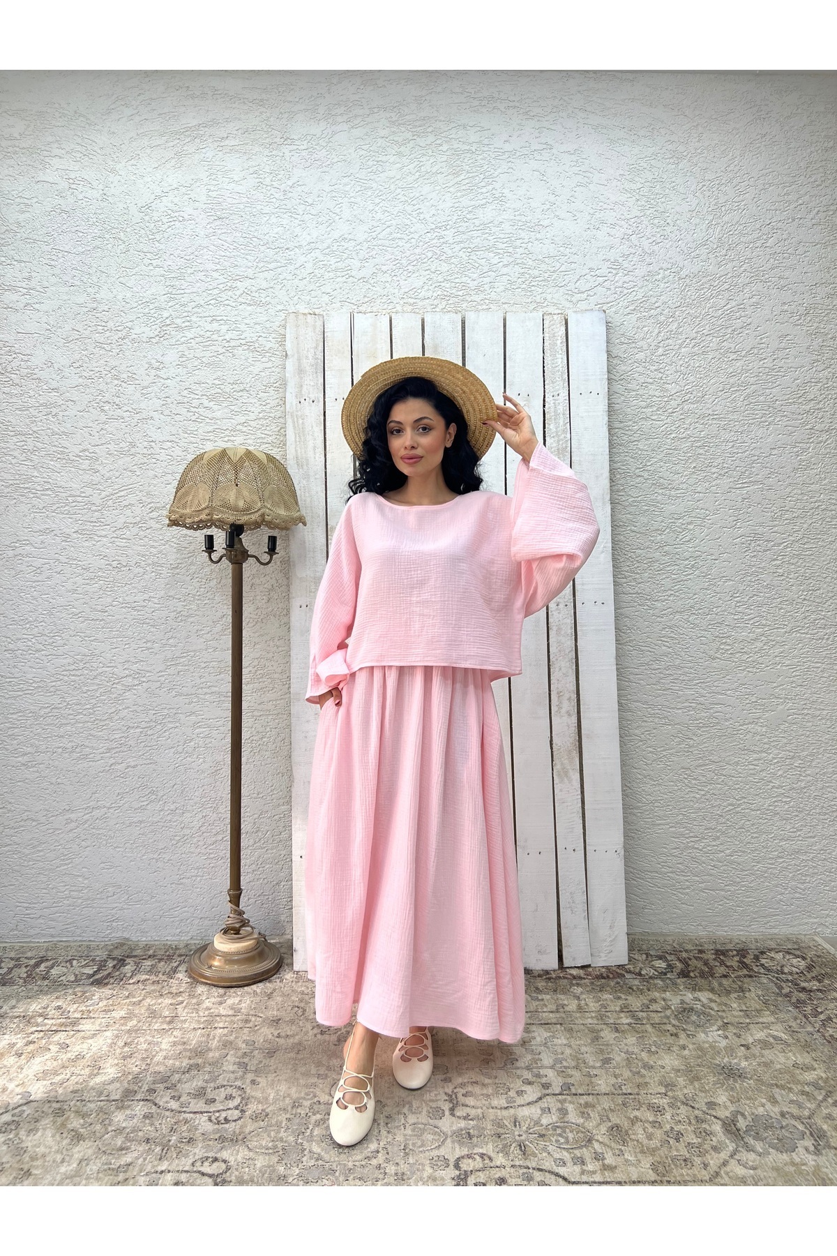 Toz Pembe Müslin Salaş Bluz Ve Kloş Etek Takımı (2'Lİ TAKIM) Toz Pembe Müslin Salaş Bluz Ve Kloş Etek Takımı (2'Lİ TAKIM) KCGM13335 L/XL