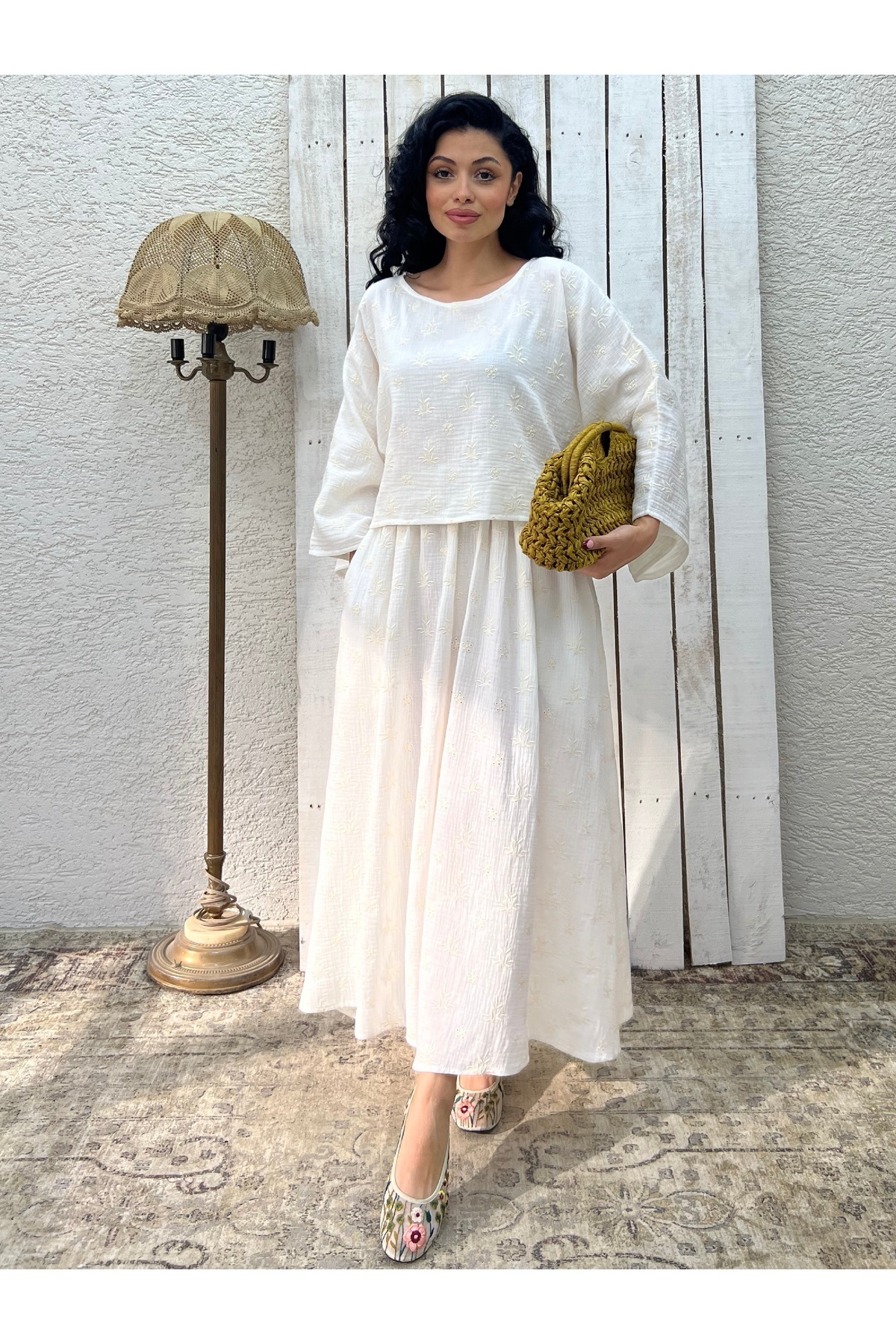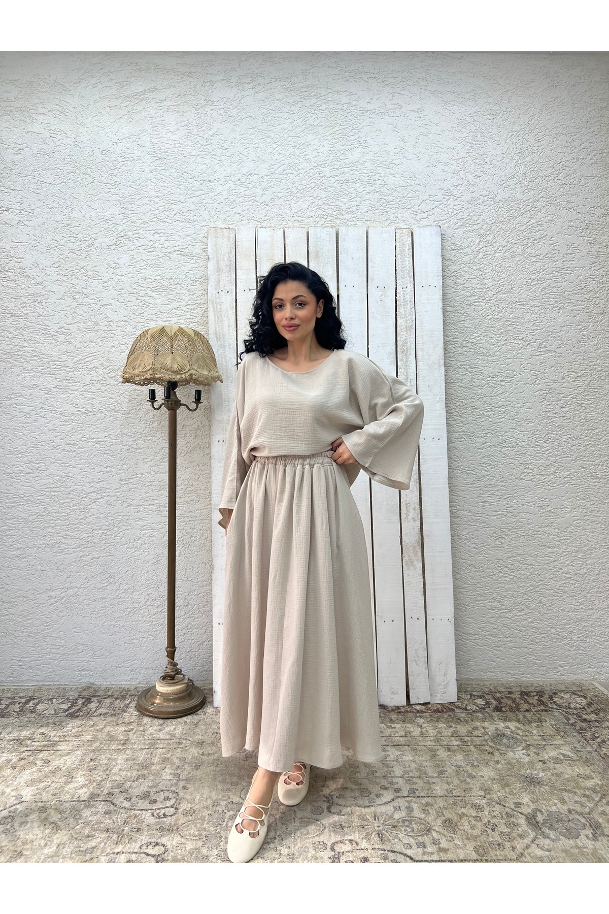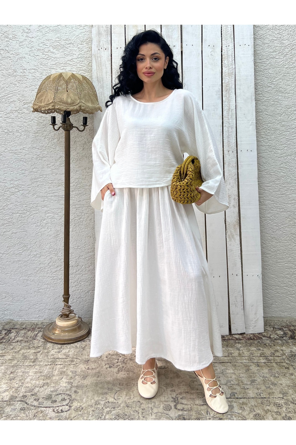 Krem Müslin Salaş Bluz Ve Kloş Etek Takımı (2'Lİ TAKIM) Krem Müslin Salaş Bluz Ve Kloş Etek Takımı (2'Lİ TAKIM) KCGM13335 L/XL
