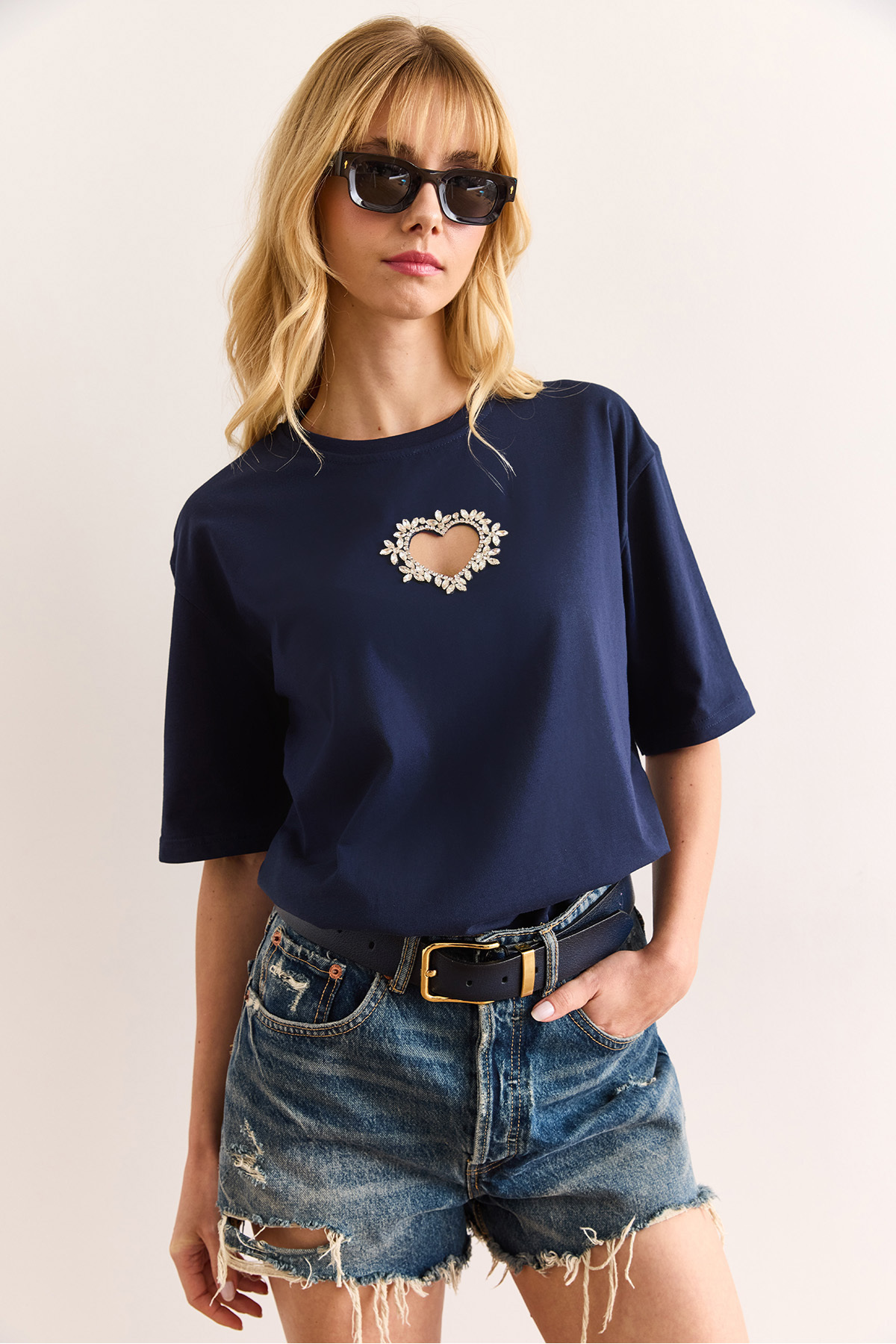 Kadın Lacivert Kalp Taş Baskılı Regular Fit Pamuk Tişört TSH-19000908 Kadın Lacivert Kalp Taş Baskılı Regular Fit Pamuk Tişört TSH-19000908 XL