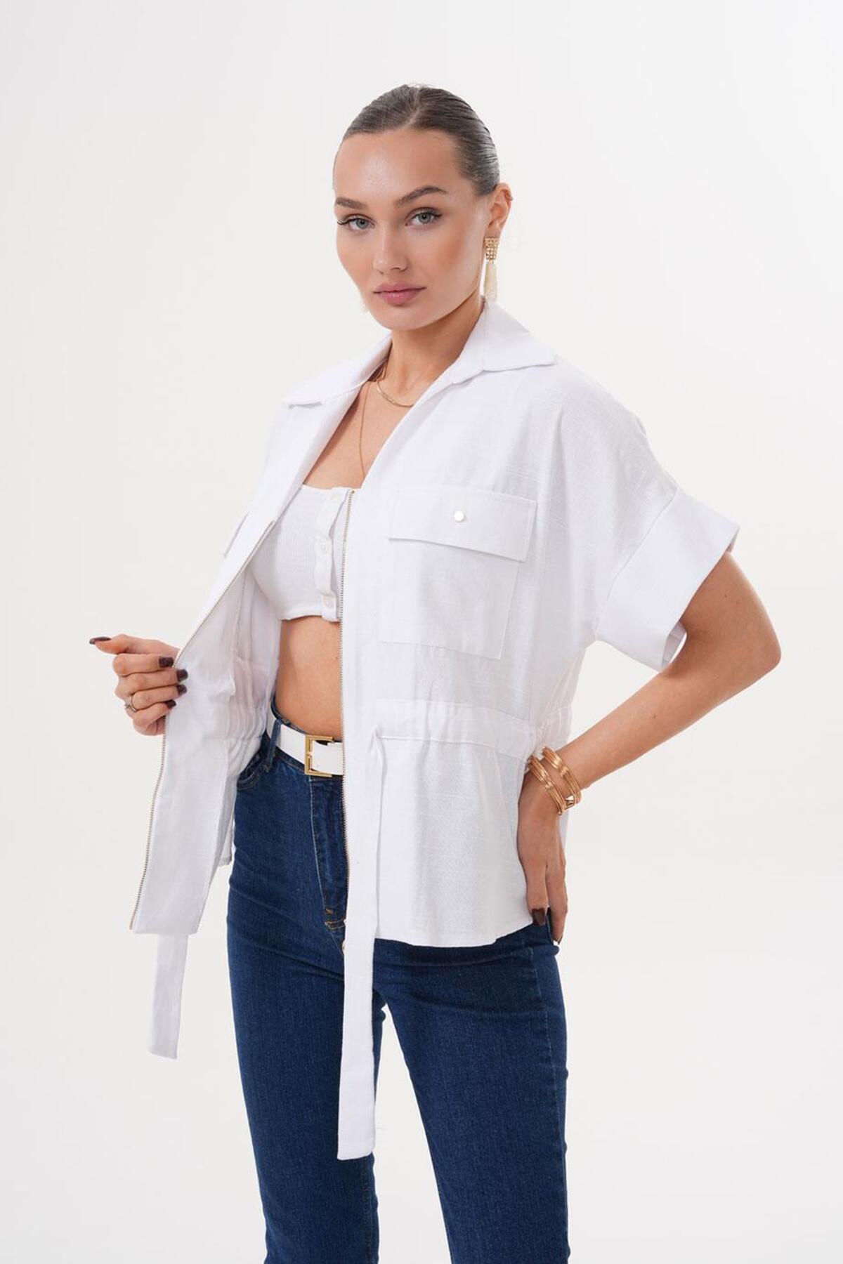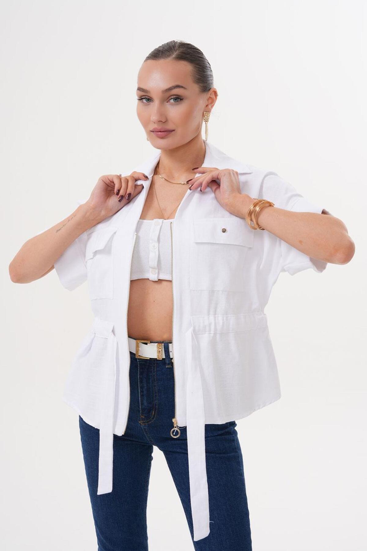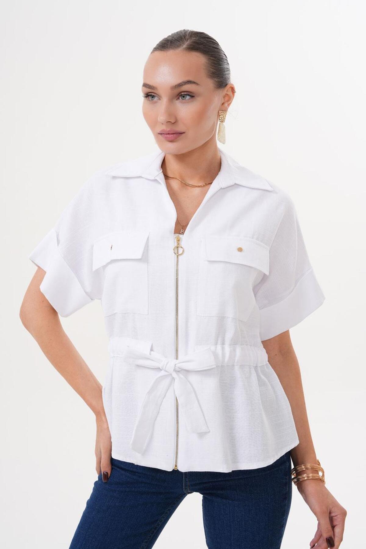 Çift Cepli Ön Fermuarlı Beli Bağlamalı Kısa Kollu Bluz SRP2047 Çift Cepli Ön Fermuarlı Beli Bağlamalı Kısa Kollu Bluz SRP2047 L