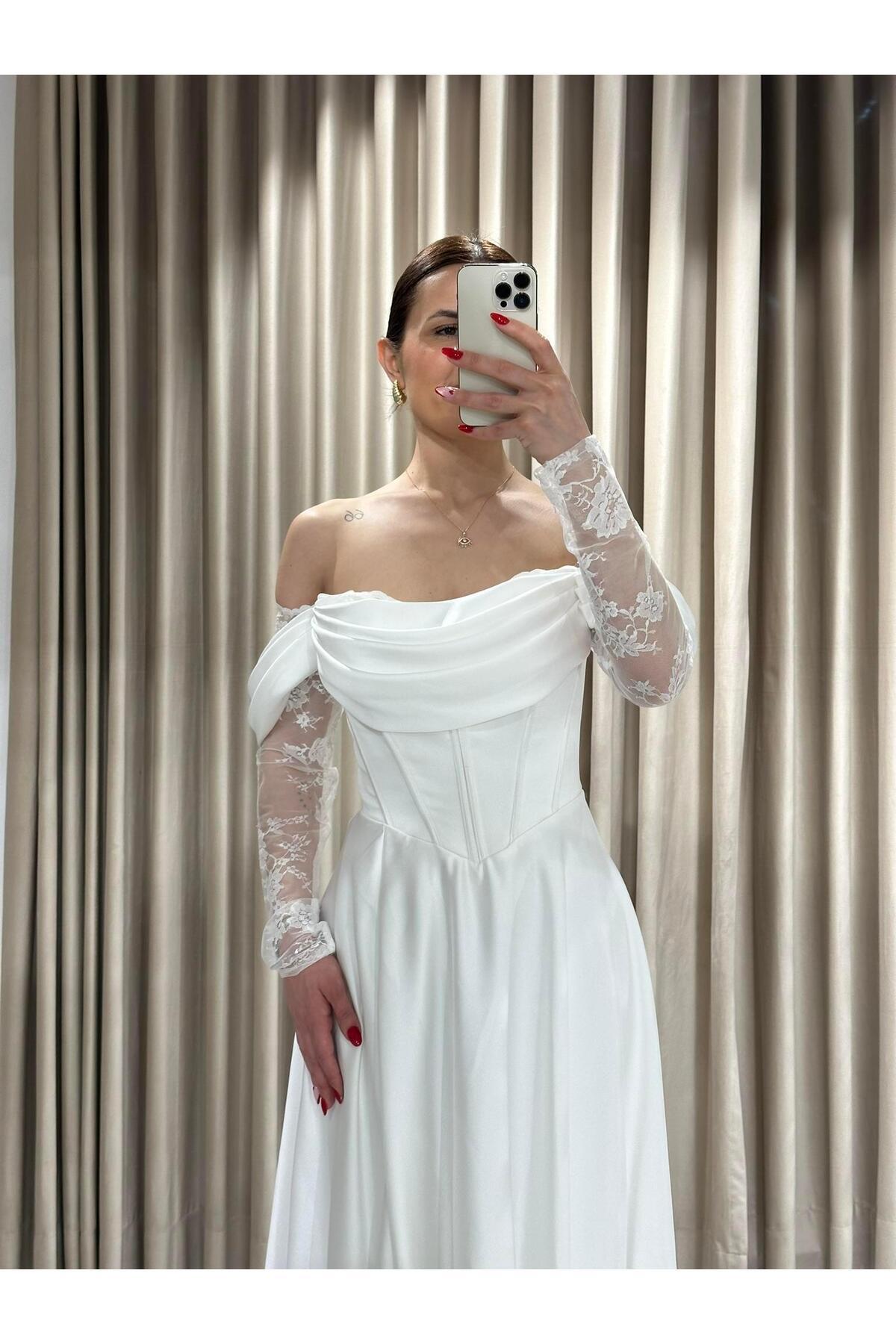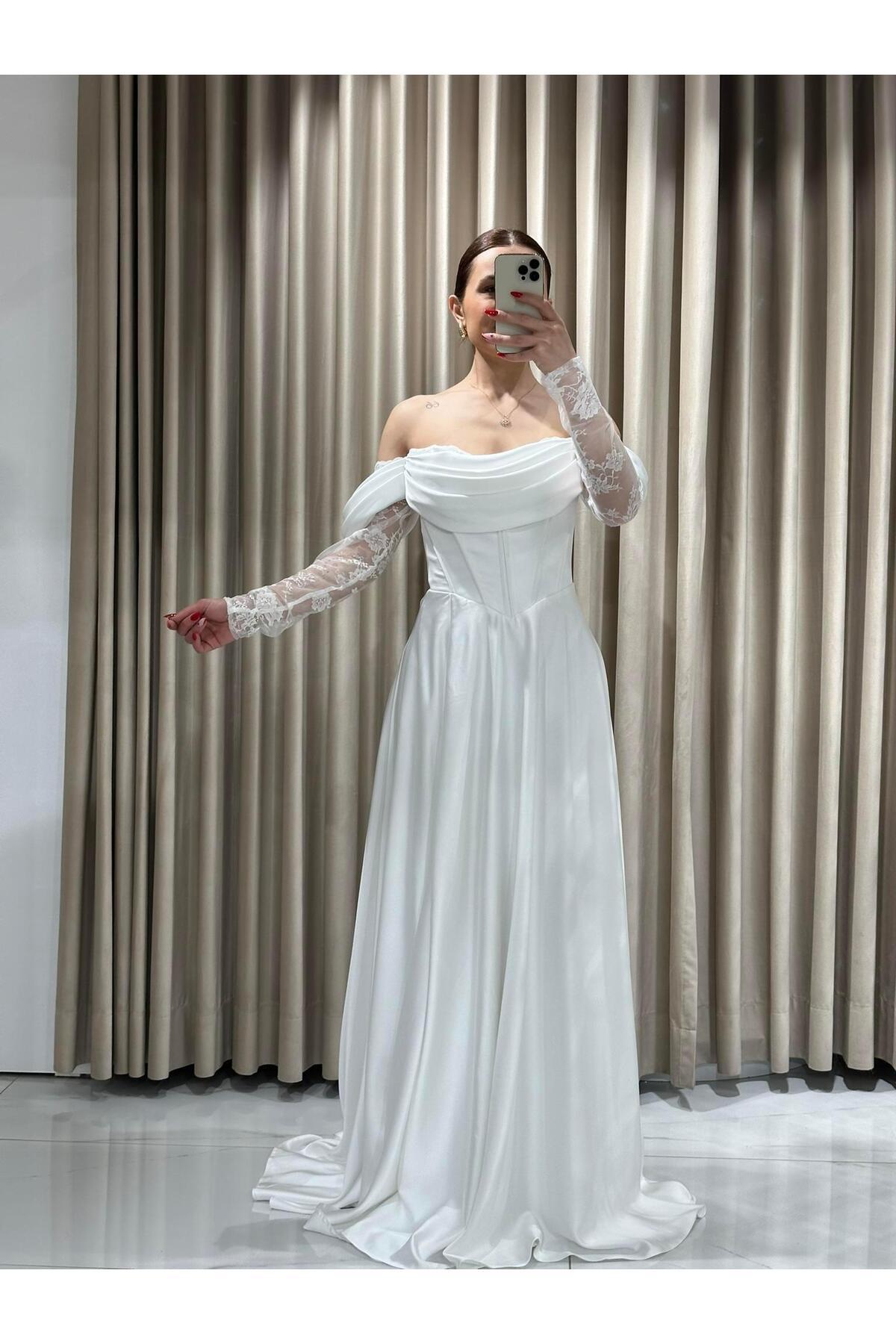 Beyaz Kayık Yaka Dantel Kollu Abiye Elbise 5561 Beyaz Kayık Yaka Dantel Kollu Abiye Elbise 5561 En5561 48