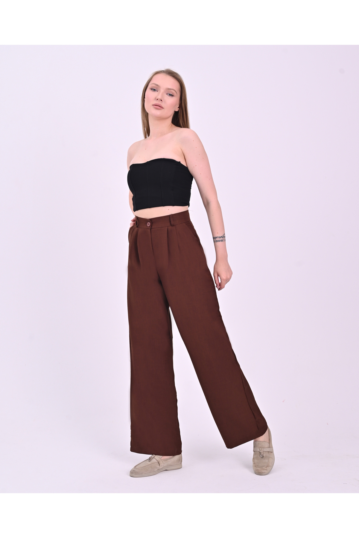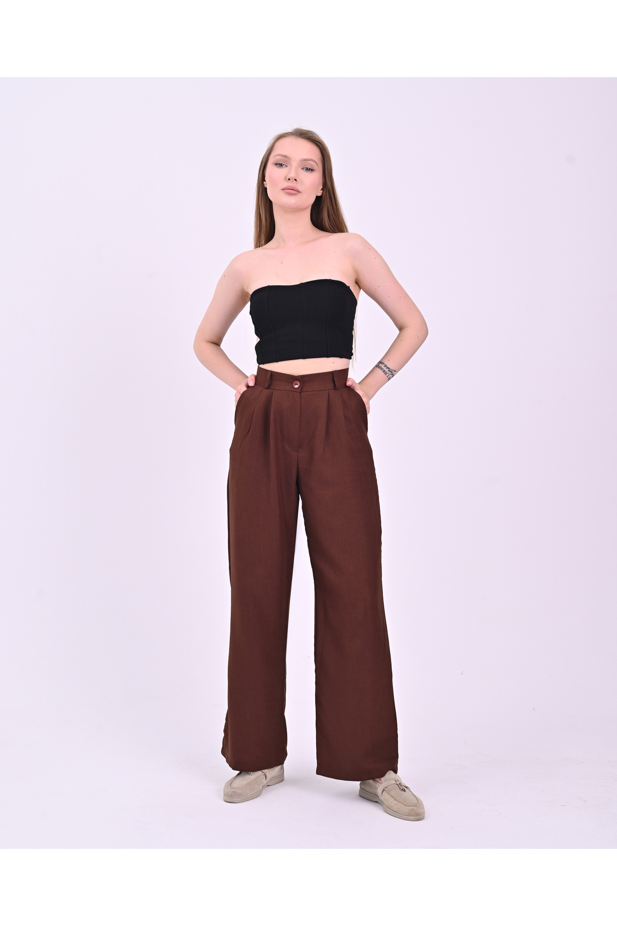 Kadın Kahverengi Yüksek Bel Keten Palazzo Pantolon Kadın Kahverengi Yüksek Bel Keten Palazzo Pantolon POL2301 50
