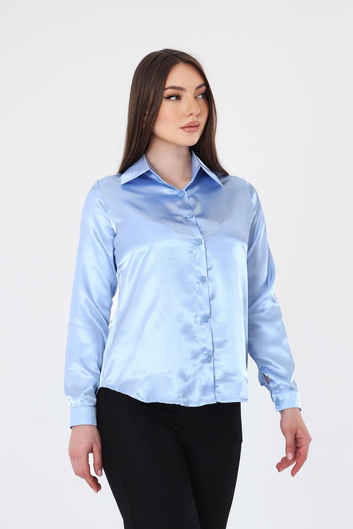 Kadın Hafif Dökümlü Bebe Mavi Saten Gömlek Kadın Hafif Dökümlü Bebe Mavi Saten Gömlek POL3964 46
