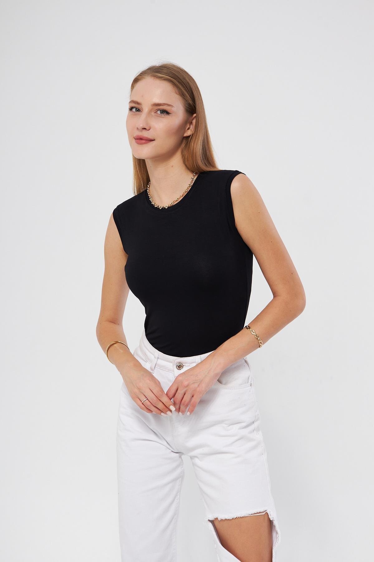 Kadın Siyah Bisiklet Yaka Sıfır Kol Premium Kumaş Viskon Likralı Body Kadın Siyah Bisiklet Yaka Sıfır Kol Premium Kumaş Viskon Likralı Body studiofashion109A 1