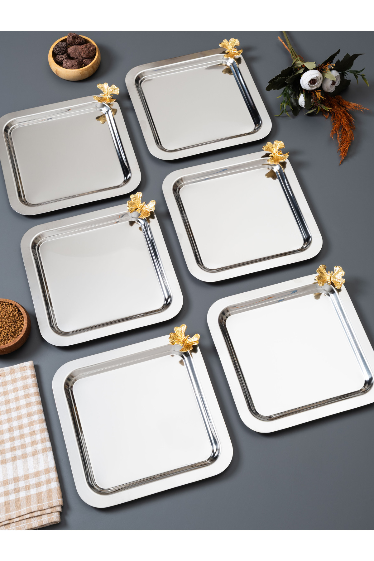 6 Lı Paslanmaz Çelik Kare Model 6 Lı Kahve Tepsisi Kelebek Aksesuarlı Lüx Sunum 6 Lı Paslanmaz Çelik Kare Model 6 Lı Kahve Tepsisi Kelebek Aksesuarlı Lüx Sunum PRA-12696933-5815 تک سایز