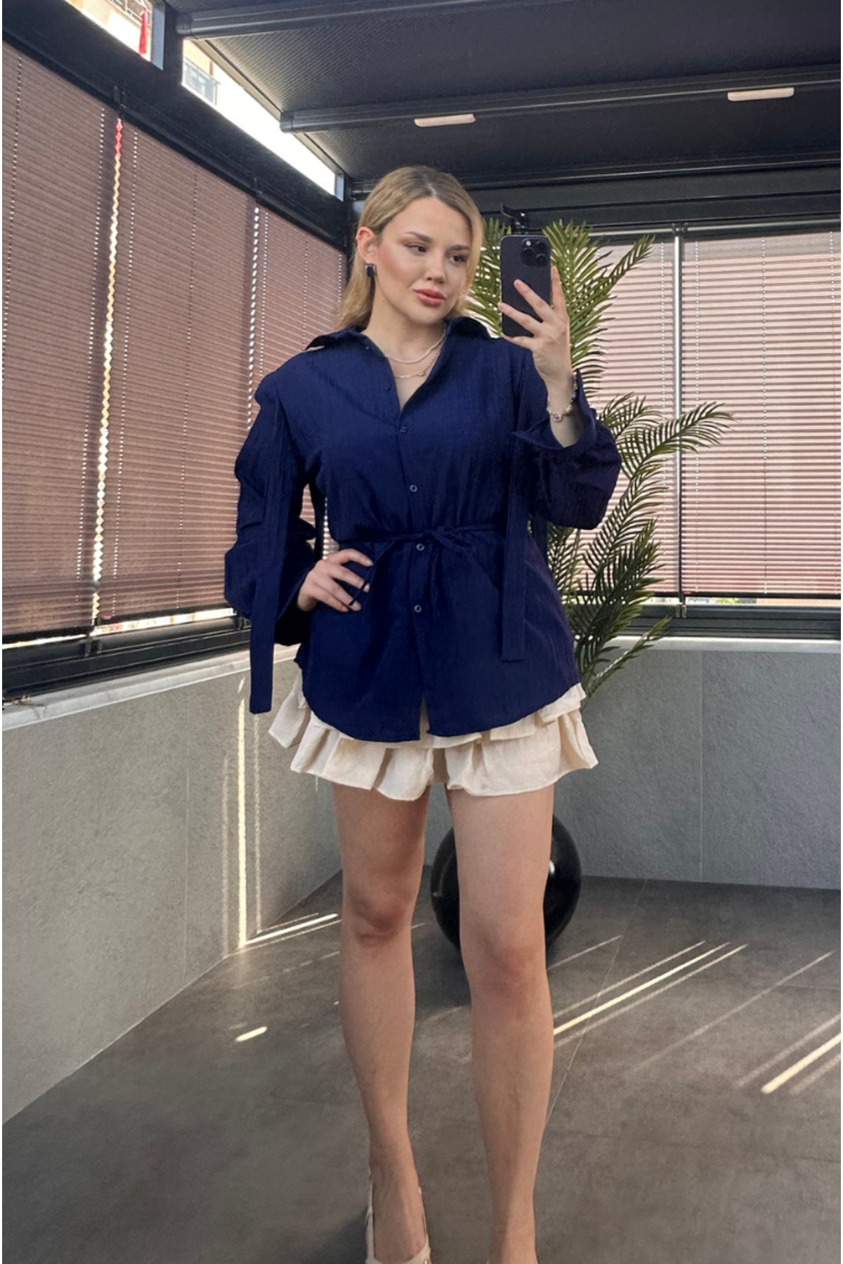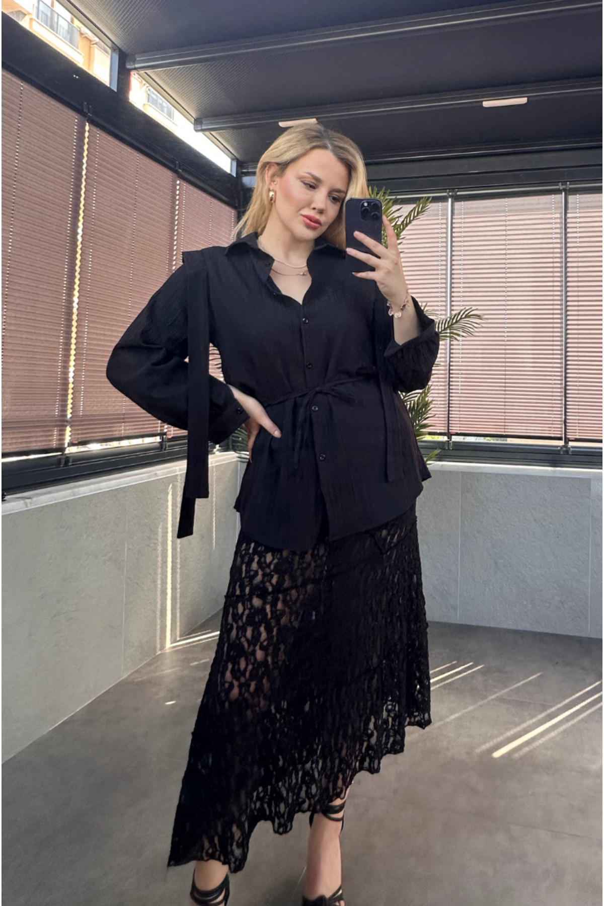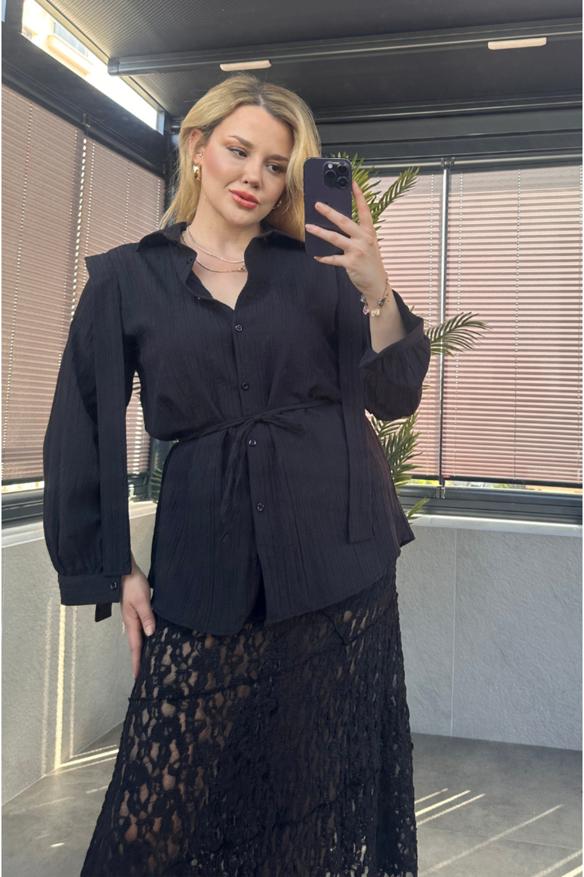 Siyah Tasarım Bağlama Detaylı Gofre Kumaş Gömlek Siyah Tasarım Bağlama Detaylı Gofre Kumaş Gömlek 1905 42