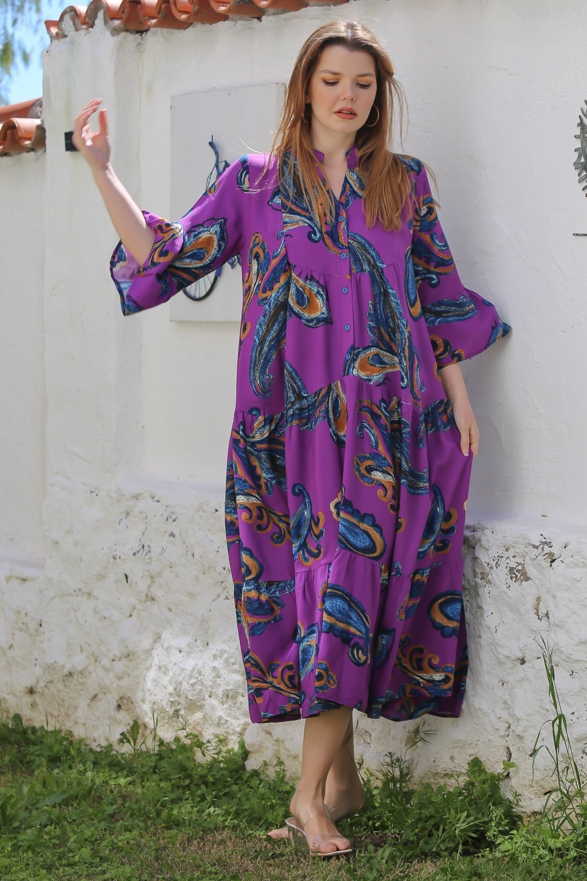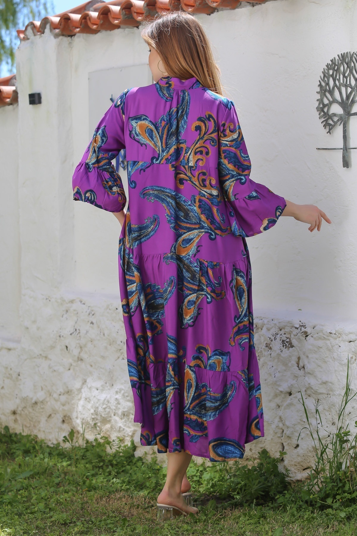 Mor V Yaka Fırfırlı Kol Şal Desenli Düğmeli Eteği Fırfırlı Casual Viskon Dokuma Elbise 135 60 Mor V Yaka Fırfırlı Kol Şal Desenli Düğmeli Eteği Fırfırlı Casual Viskon Dokuma Elbise 135 60 M10160000EL90050 XL
