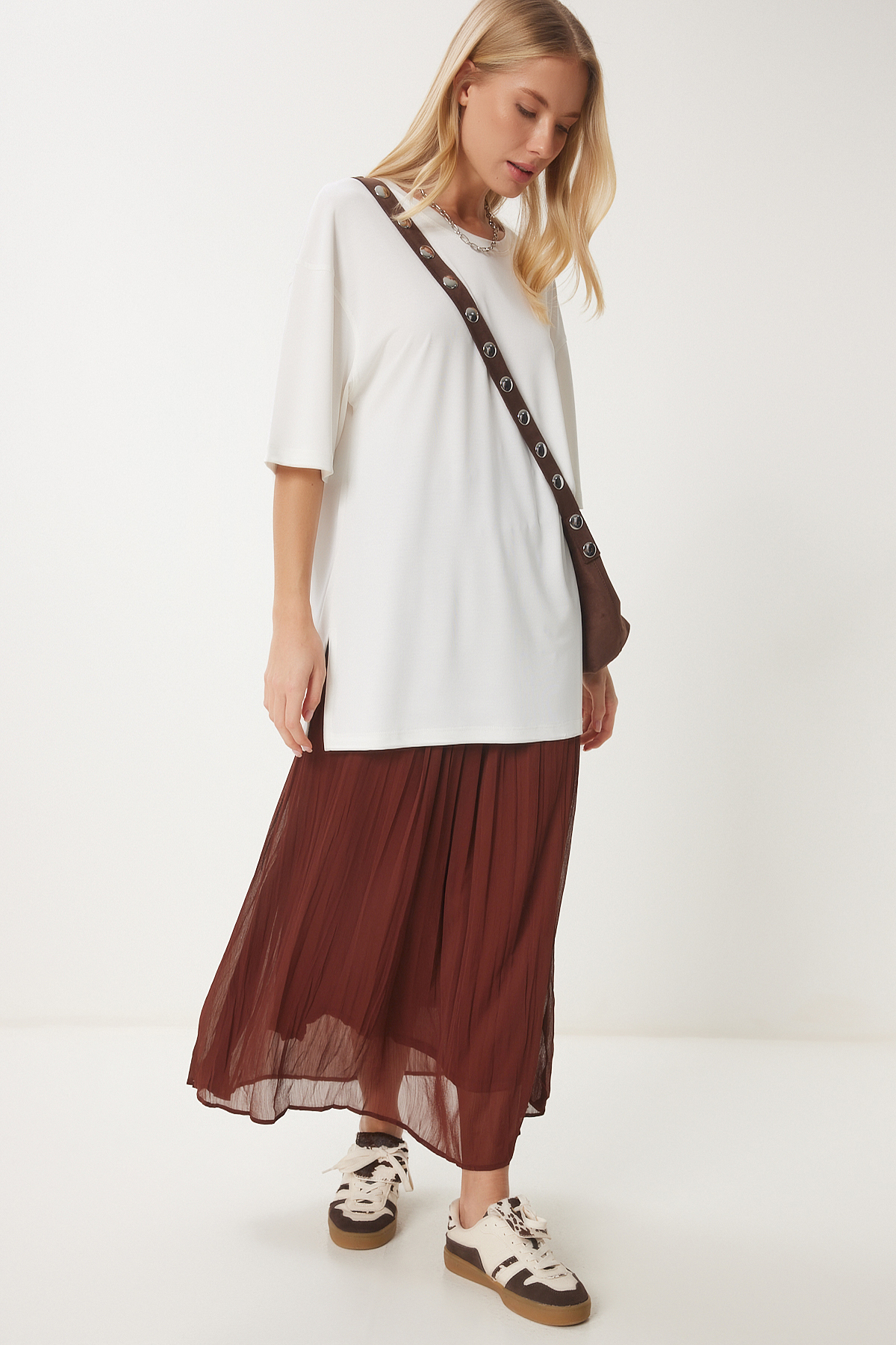 Kadın Ekru Baskılı Oversize Örme T-Shirt AN00245 Kadın Ekru Baskılı Oversize Örme T-Shirt AN00245 M/L