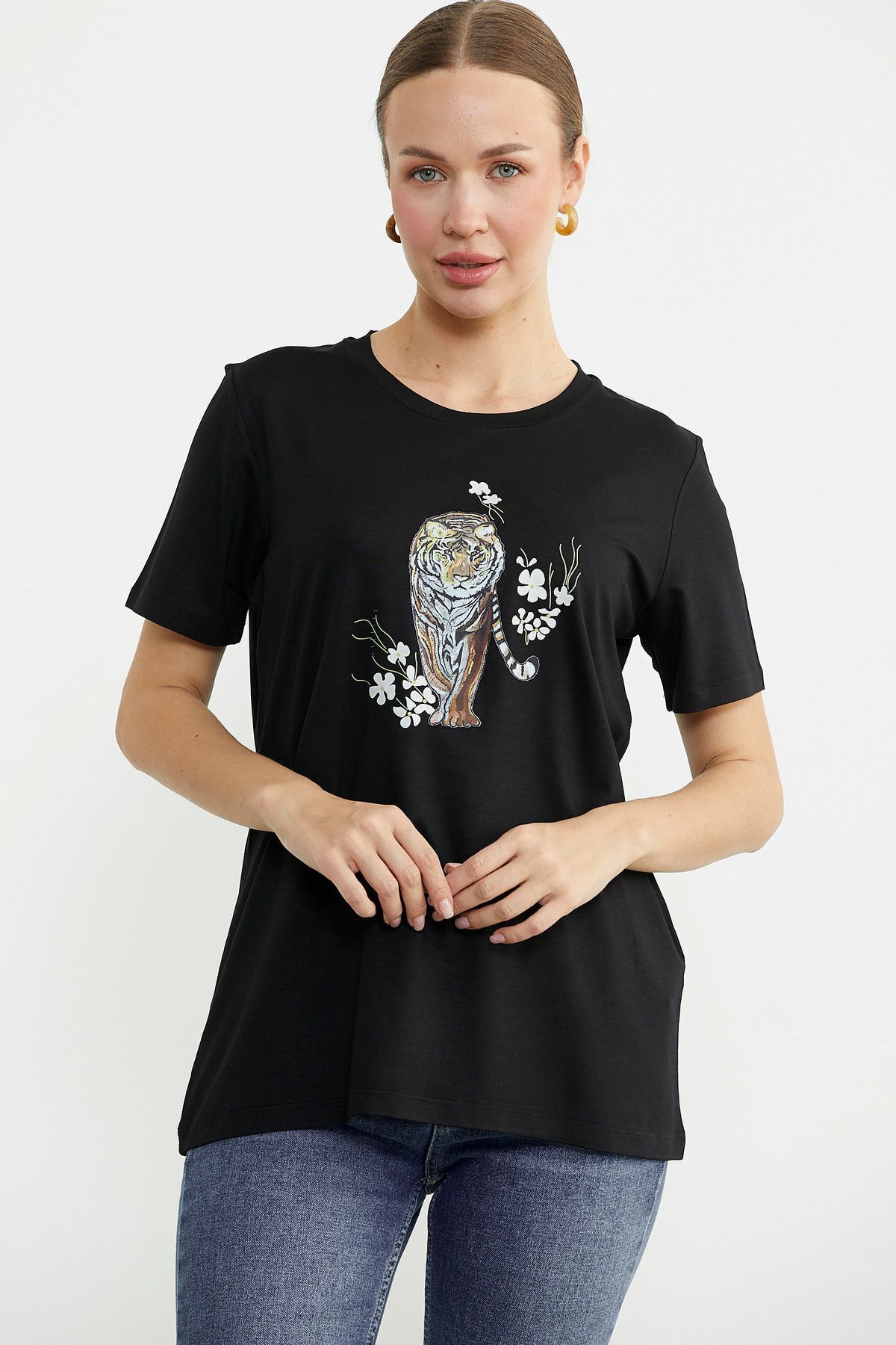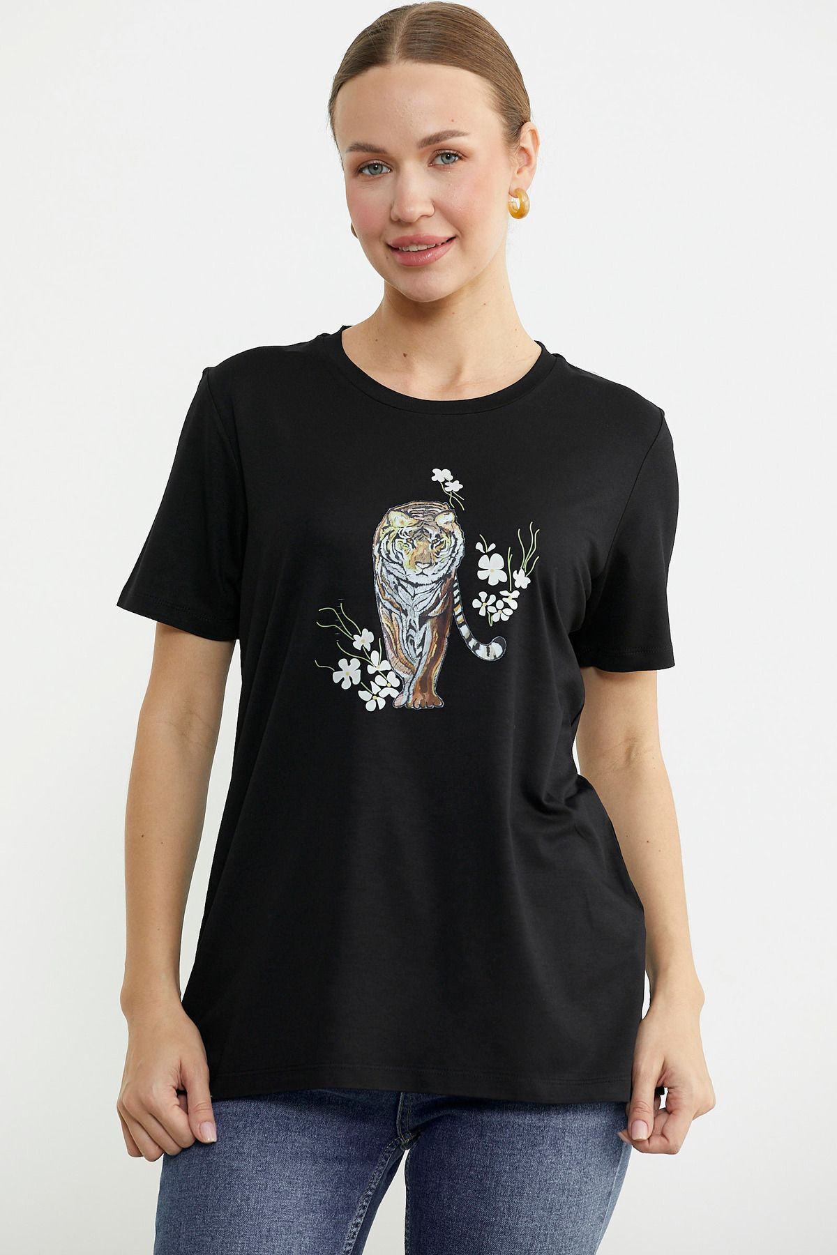 Hayvan Figür Baskılı Dökümlü Tişört - Siyah Hayvan Figür Baskılı Dökümlü Tişört - Siyah 25Y2231-60081.0001 2XL