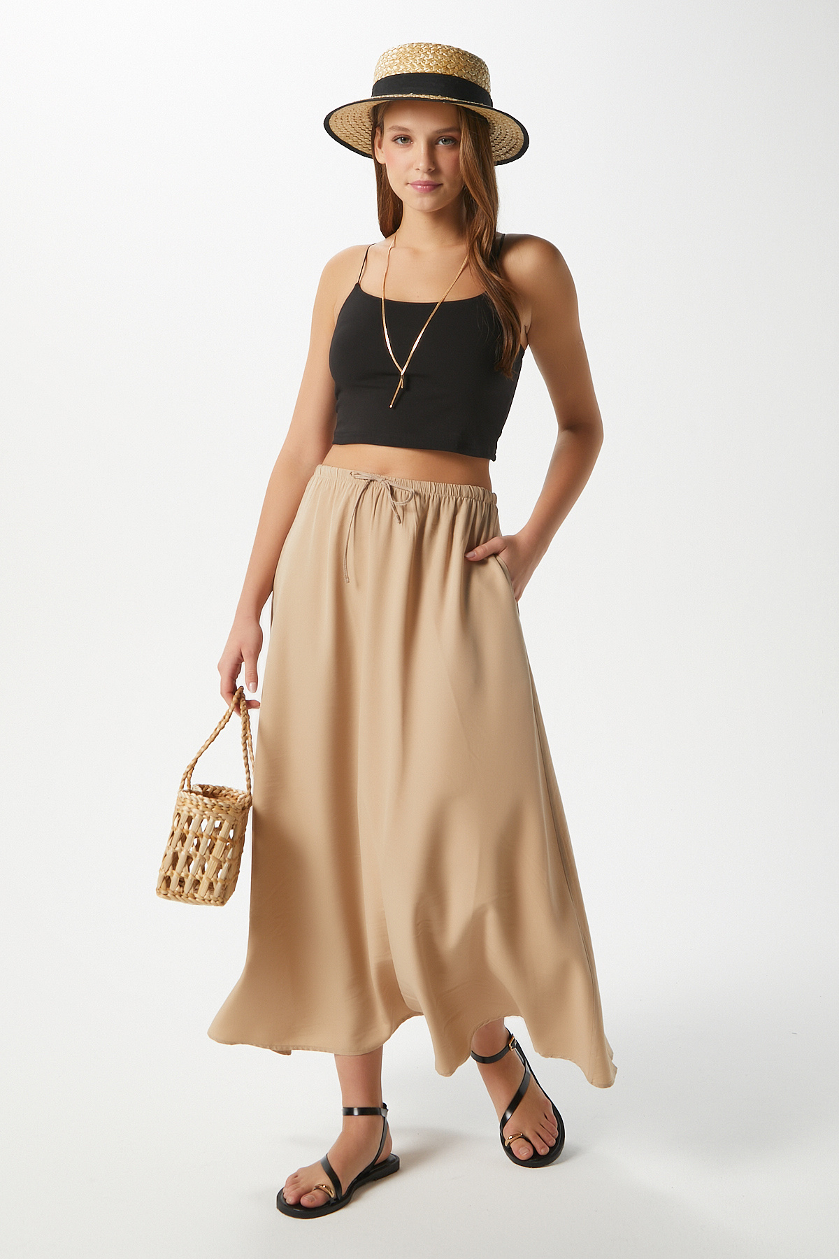 Kadın Trend Modal Serin Kumaş Bej Bel Lastikli Cepli Rahat Kalıp Uzun Etek Kadın Trend Modal Serin Kumaş Bej Bel Lastikli Cepli Rahat Kalıp Uzun Etek 1463 XL