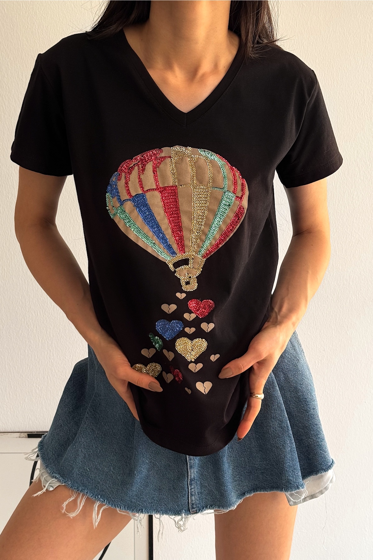 Kadın Siyah V Yaka Balon Pul Payet İşlemeli %100 Pamuk Tişört Kadın Siyah V Yaka Balon Pul Payet İşlemeli %100 Pamuk Tişört FEM61 L