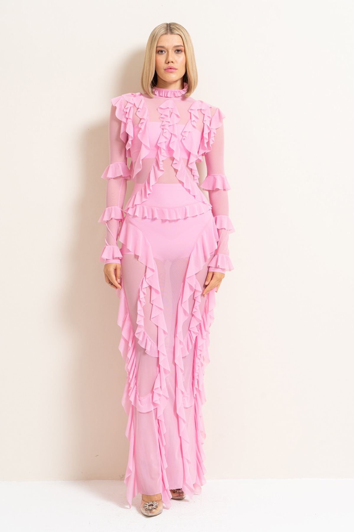 Yeni Fuşya Askılı Uzun Güpür Elbise Yeni Fuşya Askılı Uzun Güpür Elbise 58694 M