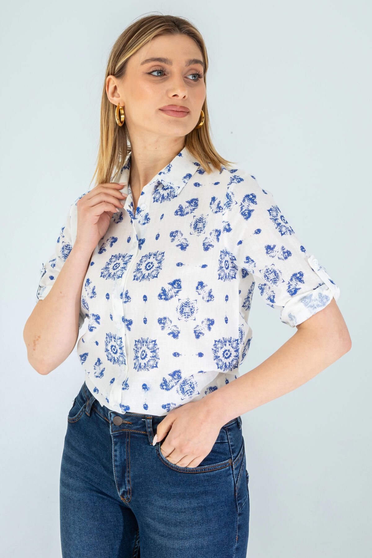 Kadın Mavi Desenli Keten Kol Katlamalı Gömlek Kadın Mavi Desenli Keten Kol Katlamalı Gömlek 150102 XL