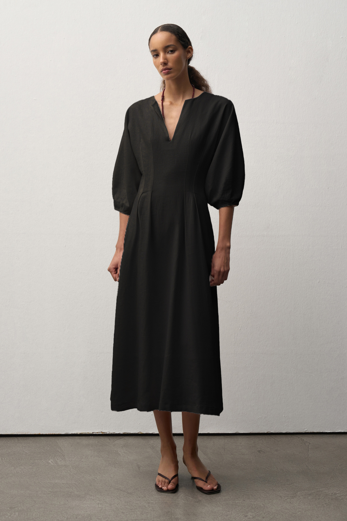 Kadın Siyah Keten Balon Kol Midi Elbise Kadın Siyah Keten Balon Kol Midi Elbise MTH46285 L