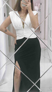Omuz Uzay Vatkalı Maxi Boy Likralı Dalgıç Kumaş Elbise Üst Beyaz Alt Siyah Omuz Uzay Vatkalı Maxi Boy Likralı Dalgıç Kumaş Elbise Üst Beyaz Alt Siyah gnzouv001 L