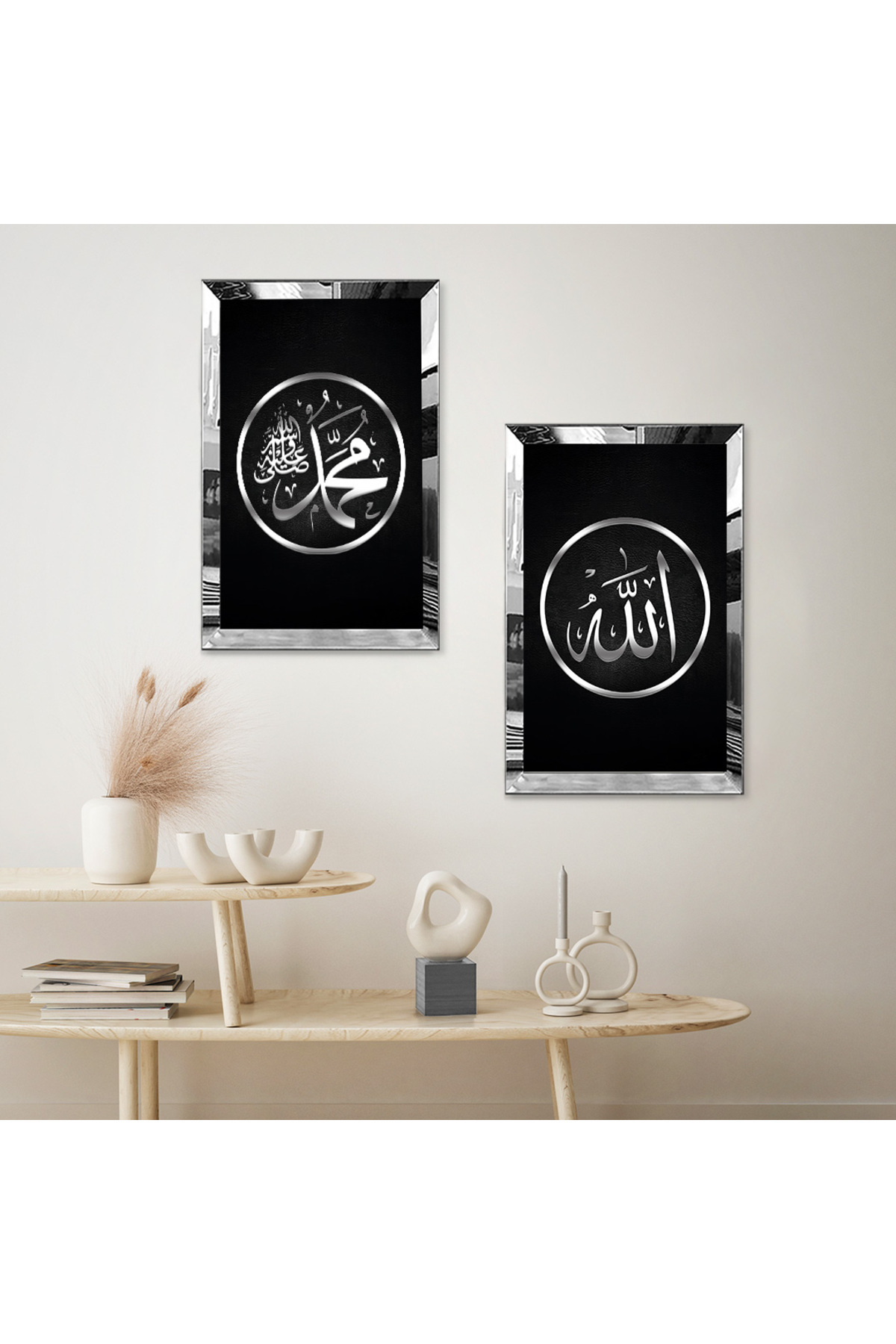 GÜMÜŞ AYNALI PLEKSİ ÇERÇEVELİ GRİ DESENLİ ALLAH VE MUHAMMET LAFZI DİNİ İKİLİ MDF TABLO SETİ GÜMÜŞ AYNALI PLEKSİ ÇERÇEVELİ GRİ DESENLİ ALLAH VE MUHAMMET LAFZI DİNİ İKİLİ MDF TABLO SETİ TMP-164A-C 50 x 70