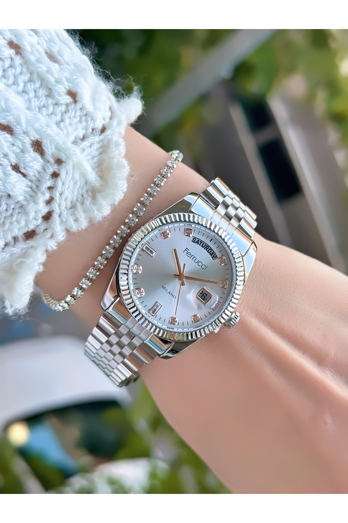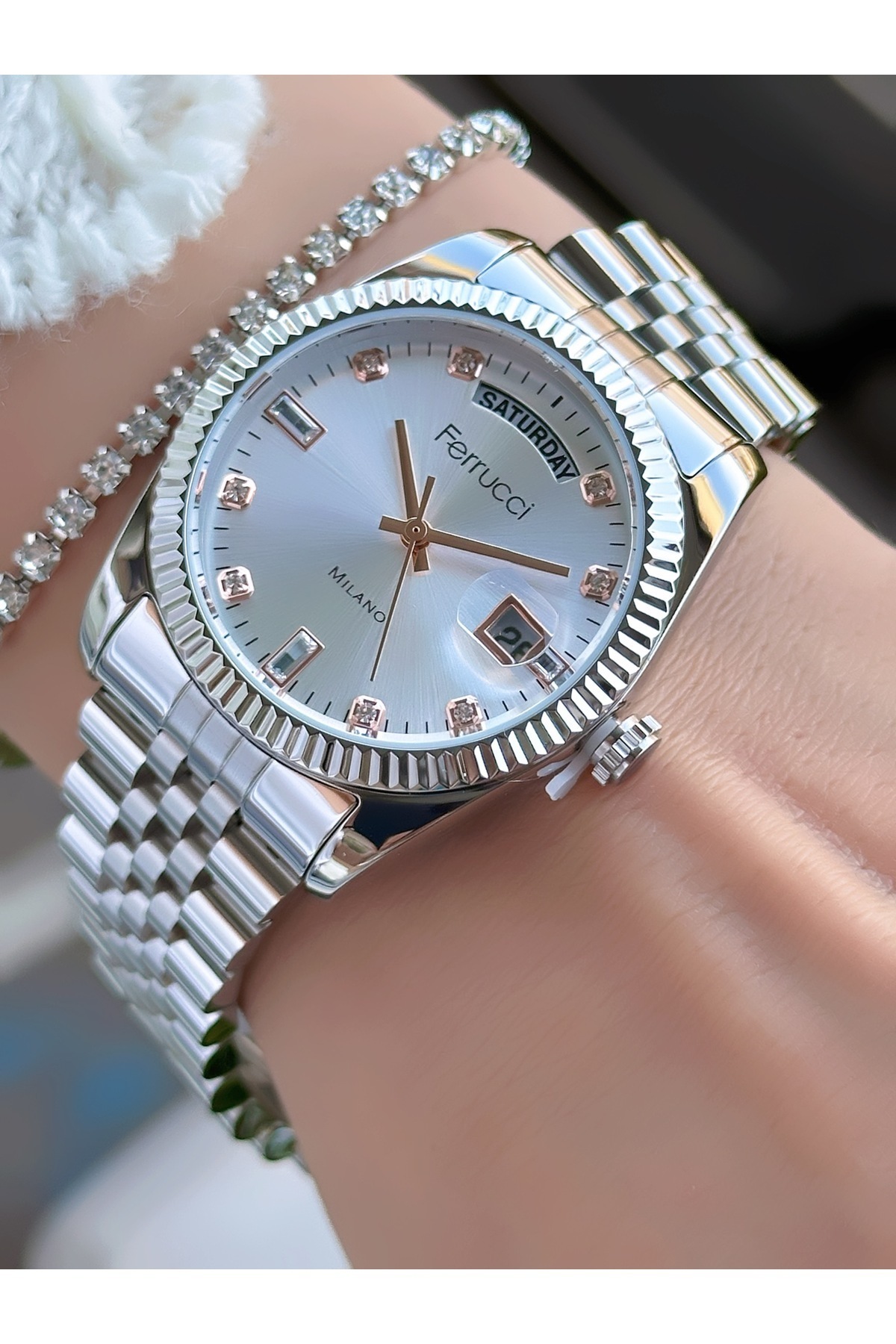 ÇELİK KORDON TAKVİMLİ KADIN KOL SAATİ 3 ATM SU GEÇİRMEZ 2 YIL GARANTİLİ ÇELİK KORDON TAKVİMLİ KADIN KOL SAATİ 3 ATM SU GEÇİRMEZ 2 YIL GARANTİLİ FERRUCCİ TAKVİMLİ KADIN SAAT 05.25 تک سایز