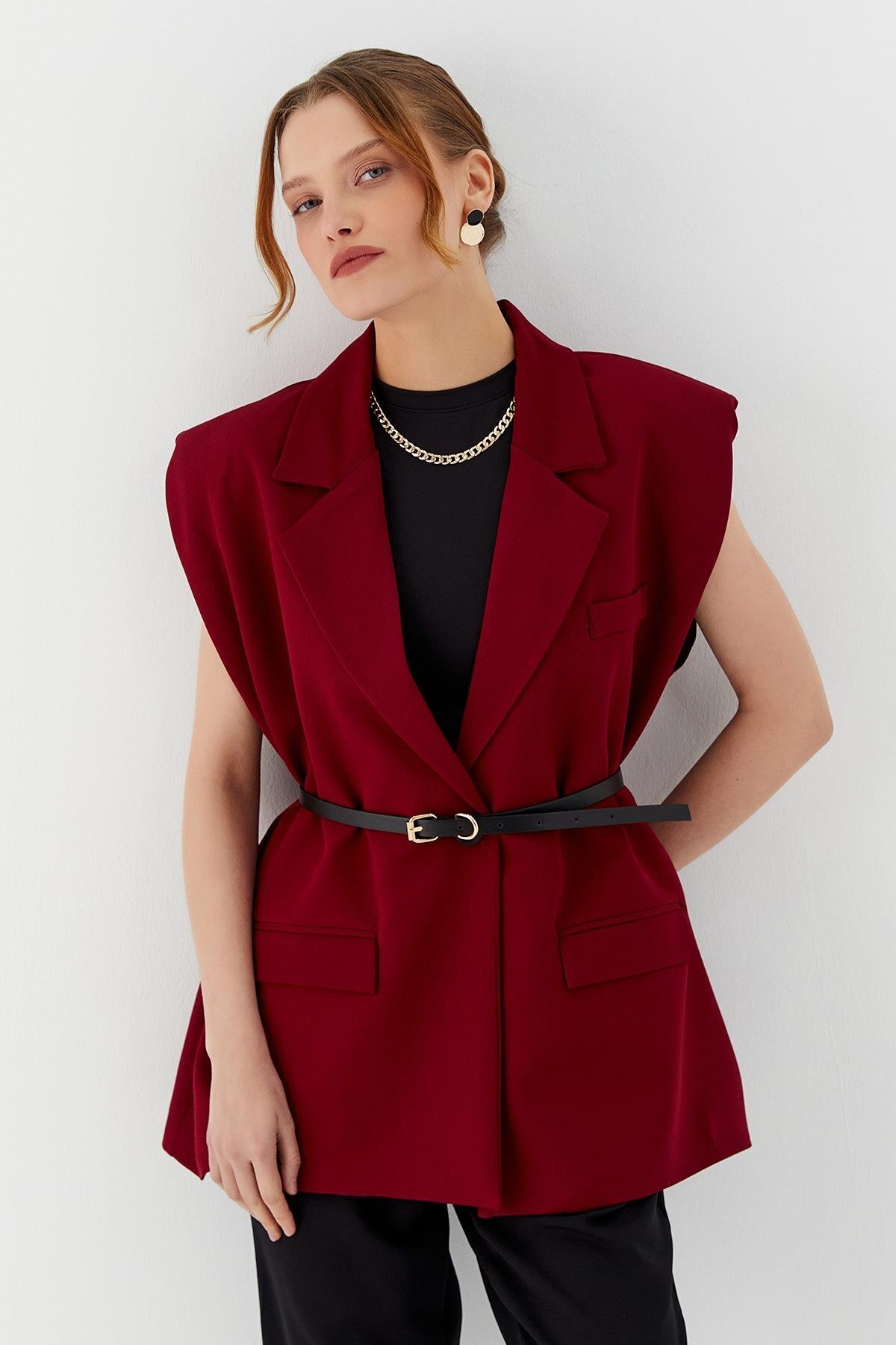 Gold Toka Kemerli Vatkalı Zarif Oversize Yelek Gold Toka Kemerli Vatkalı Zarif Oversize Yelek y2025 XL