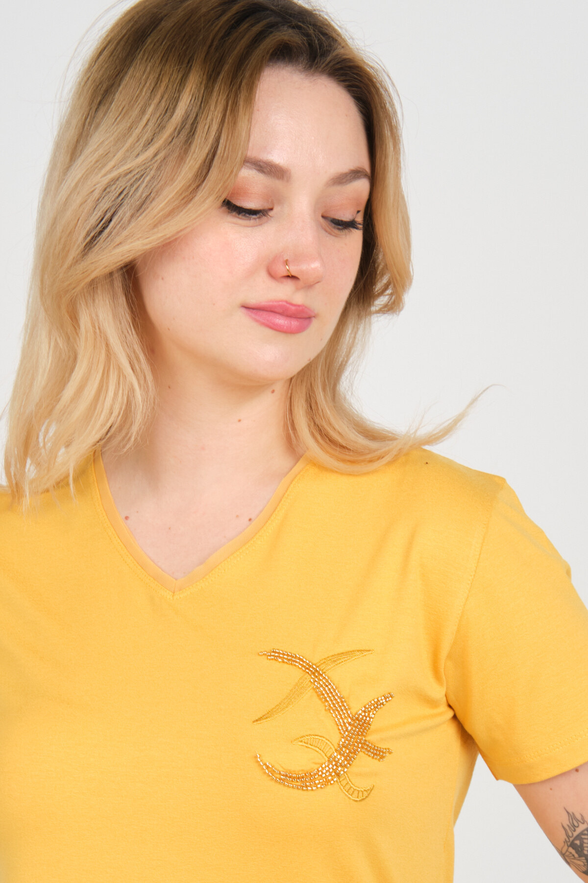 Kadın V Yaka Boncuk İşlemeli Kısa Kol Bluz 4142 Sarı Kadın V Yaka Boncuk İşlemeli Kısa Kol Bluz 4142 Sarı 81472202424142 XL