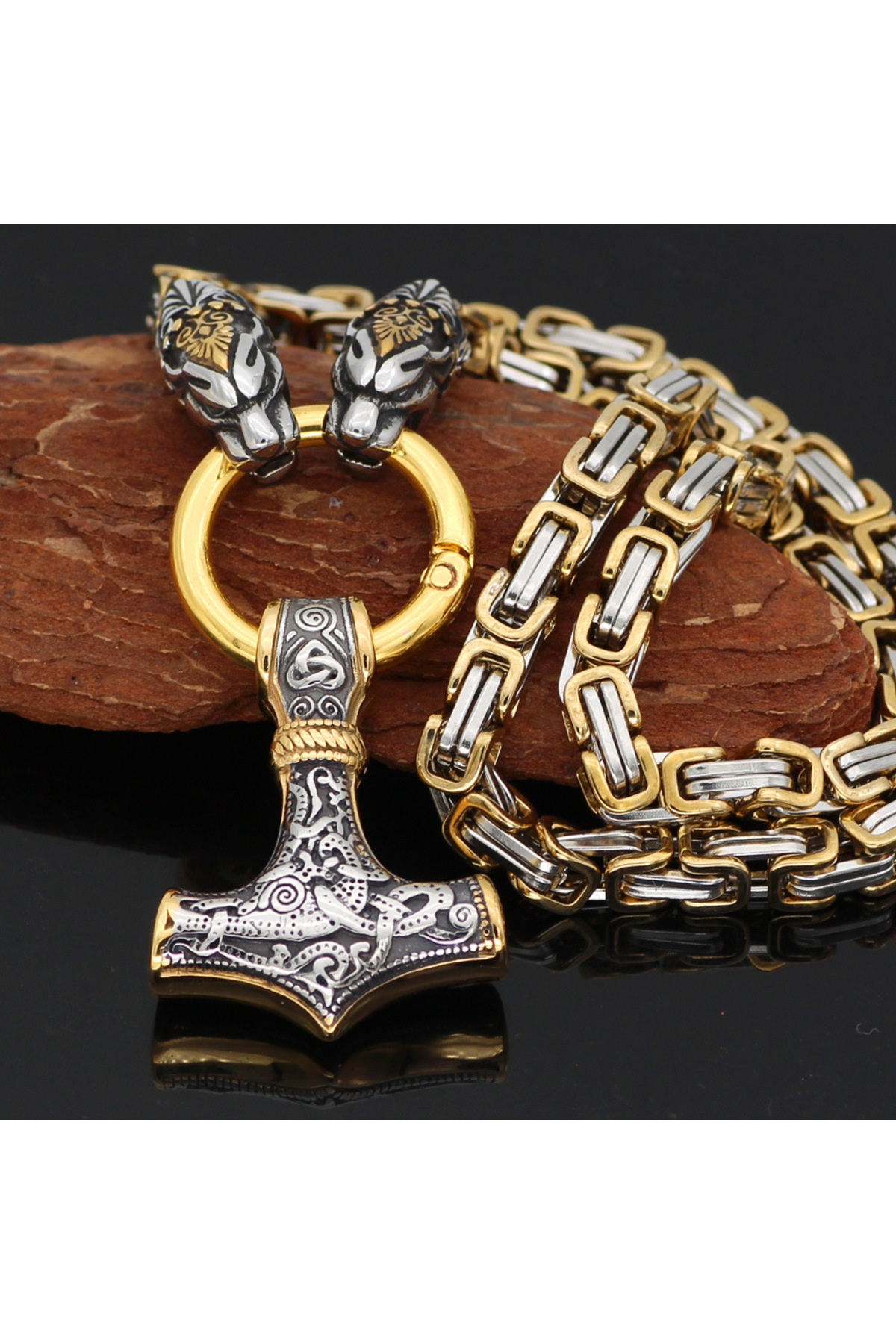 Ejderha Dragon Kafası Iskandinav Motifli Thor Mjollnir & Kral Zincir 316l Çelik Kolye Ejderha Dragon Kafası Iskandinav Motifli Thor Mjollnir & Kral Zincir 316l Çelik Kolye NSS00001711 70 cm