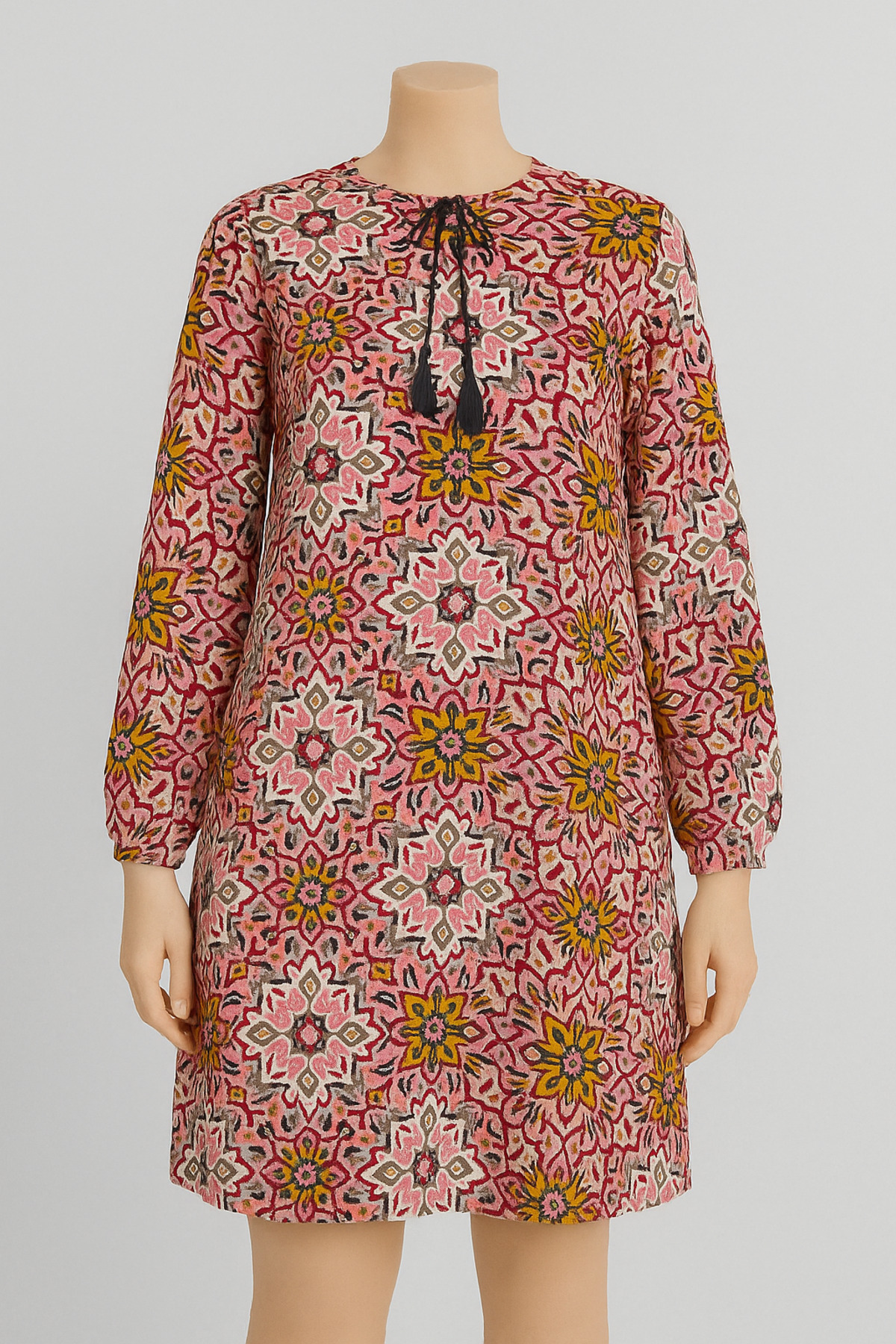 Pembe Zemin Çiçek Desenli Kadın Yazlık Kapalı Yaka Bağcıklı Tunik – Lastikli Kol, Rahat Kesim Pembe Zemin Çiçek Desenli Kadın Yazlık Kapalı Yaka Bağcıklı Tunik – Lastikli Kol, Rahat Kesim FTLLAEMPIRMETUNIK 42