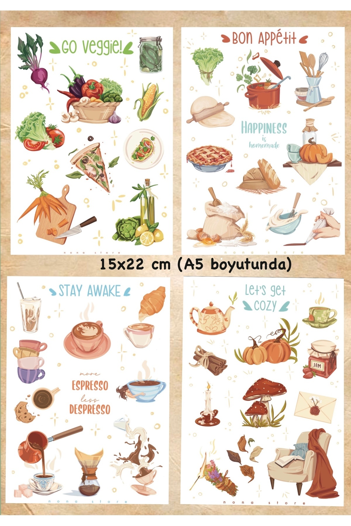 Kahve Temalı Sticker Seti / 2 adet A6 / 16 adet tam çıkartma Kahve Temalı Sticker Seti / 2 adet A6 / 16 adet tam çıkartma NDKTS83528 تک سایز