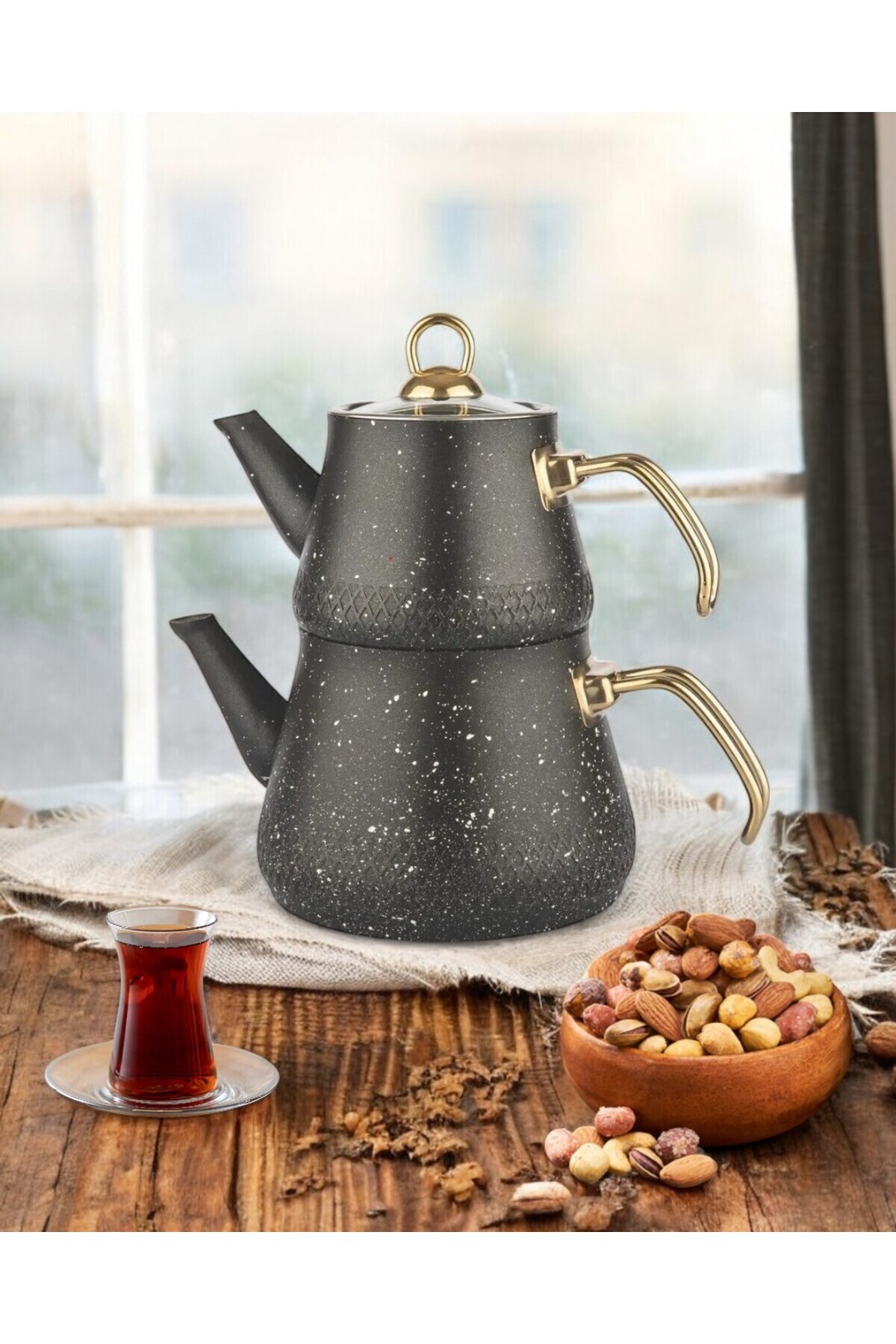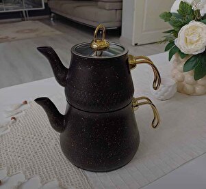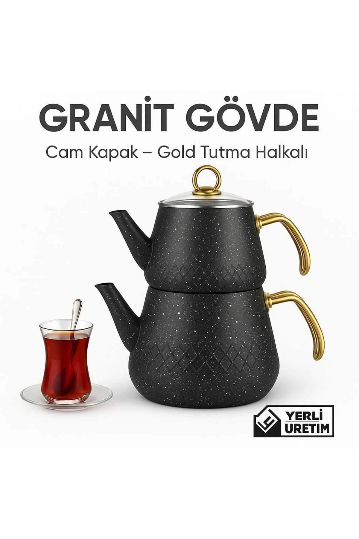 Granit Kaplama Gold Kulplu Cam Kapak Çaydanlık Siyah Granit Kaplama Gold Kulplu Cam Kapak Çaydanlık Siyah sr3078 تک سایز
