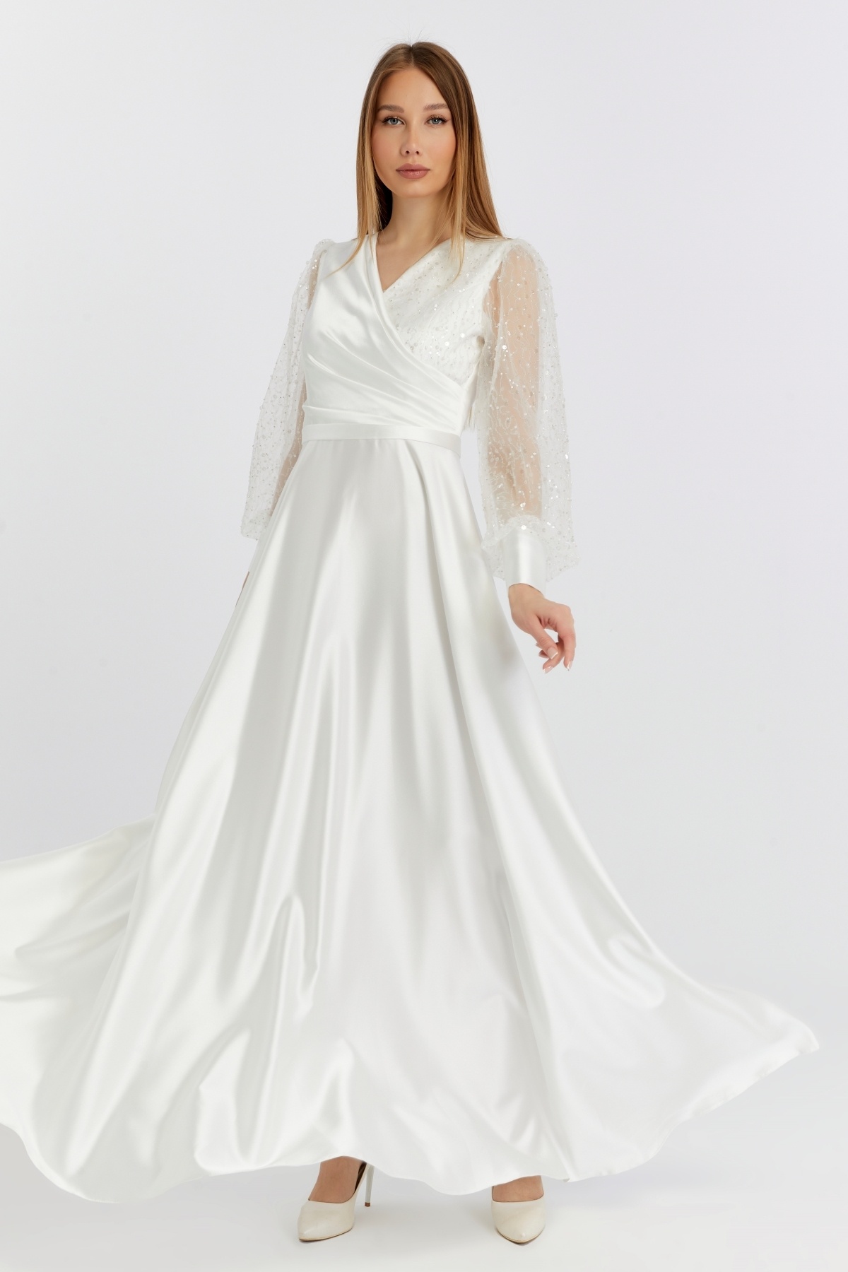 Kadın Abiye Ve Mezuniyet Orta Beden Kruvaze Yaka Saten Kumaş Ve Inci Boncuklu Tül Abiye Elbise Kadın Abiye Ve Mezuniyet Orta Beden Kruvaze Yaka Saten Kumaş Ve Inci Boncuklu Tül Abiye Elbise 60005 52