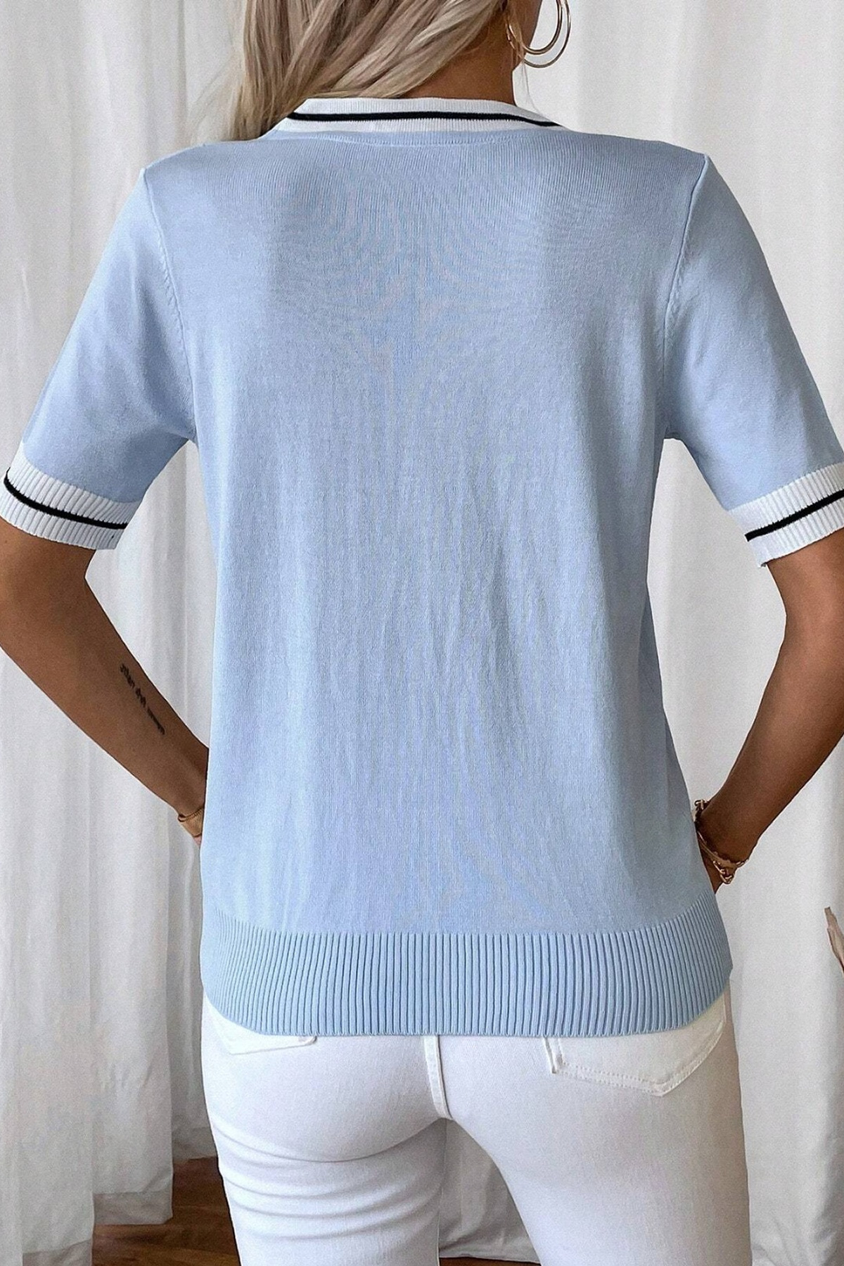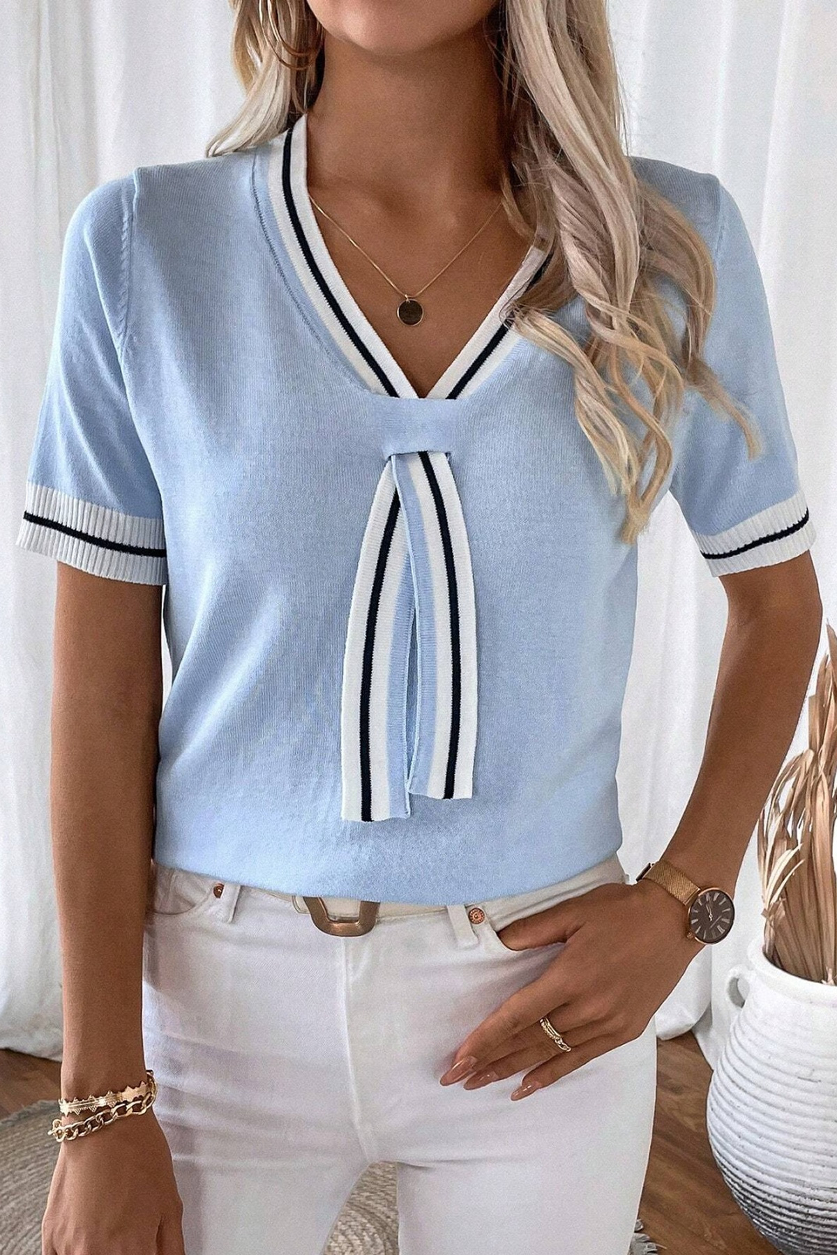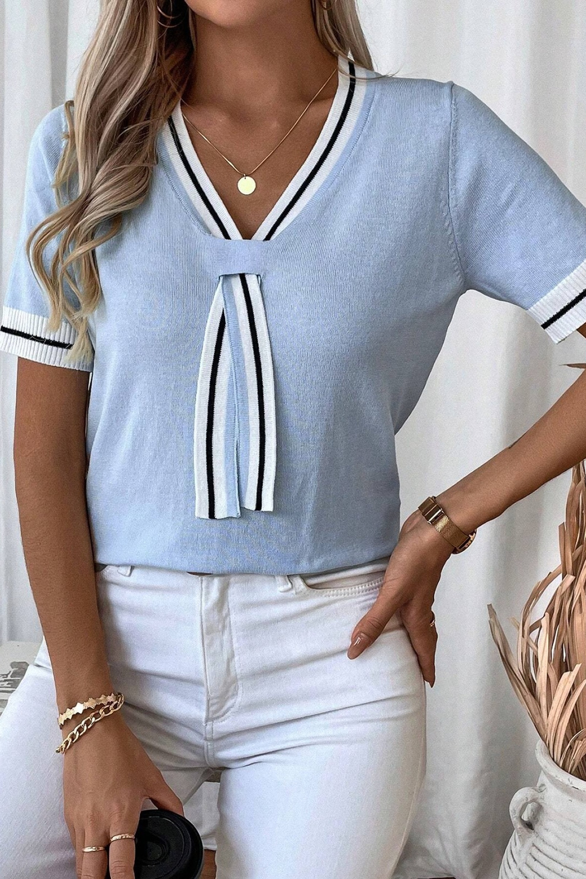 Kadın Denizci Model V Yaka Kolej Tarzı Çizgi Şeritli Polo Stil Bebe Mavisi Bluz Kadın Denizci Model V Yaka Kolej Tarzı Çizgi Şeritli Polo Stil Bebe Mavisi Bluz TR-22290 2XL