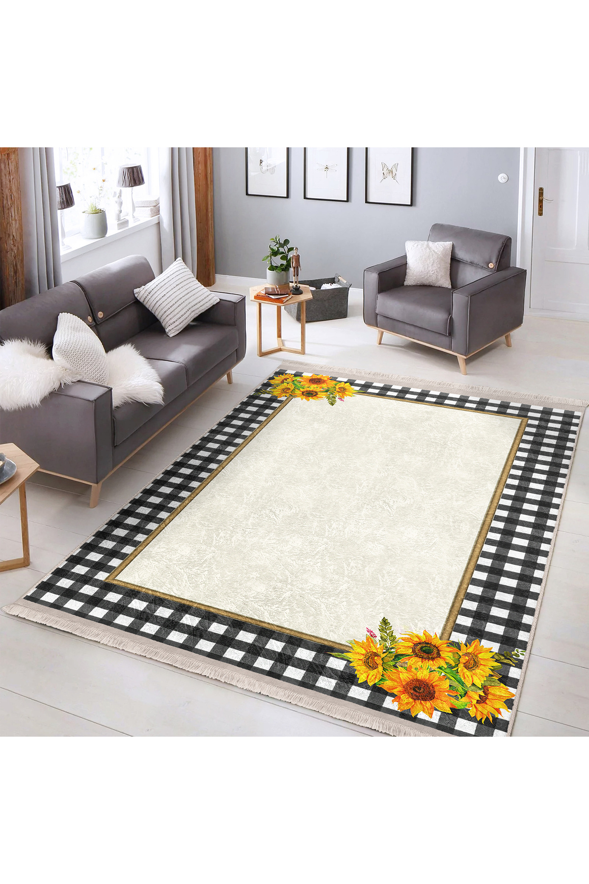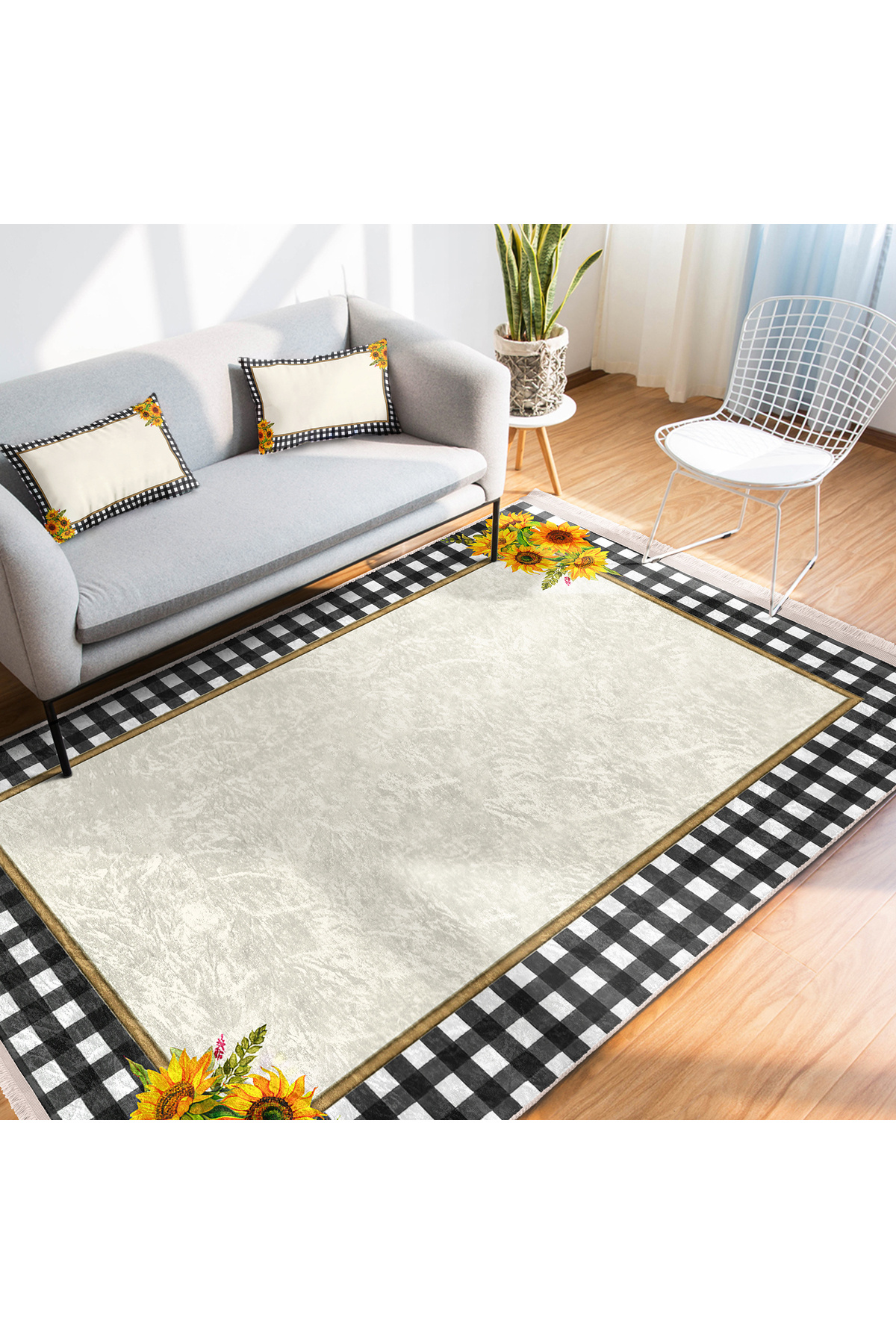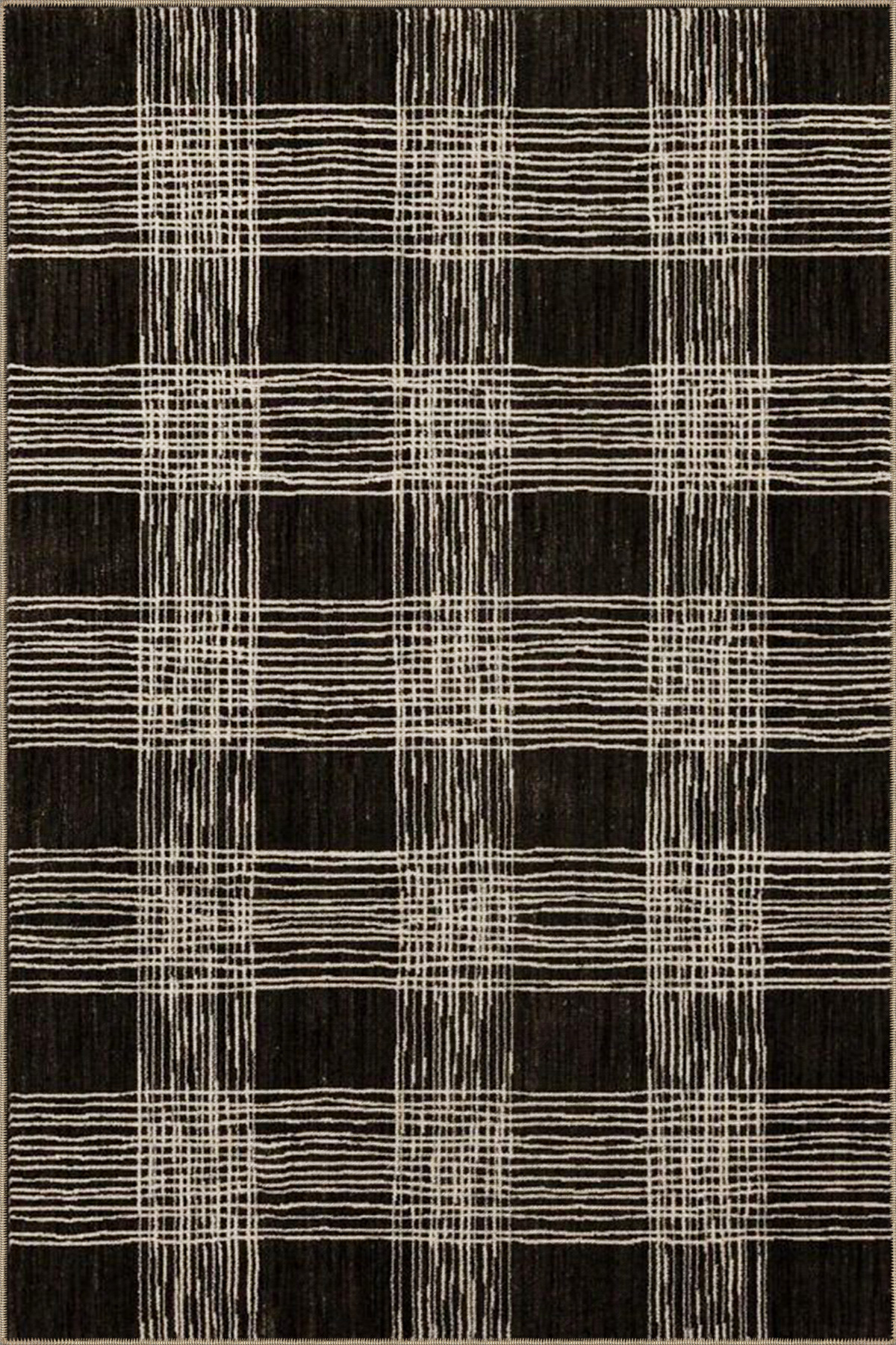 Siyah Beyaz Karodan Çiçekli Desenli Modern Salon Halısı - Yıkanabilir & Kaymaz Tabanlı Siyah Beyaz Karodan Çiçekli Desenli Modern Salon Halısı - Yıkanabilir & Kaymaz Tabanlı DikHali-11006 160 x 230