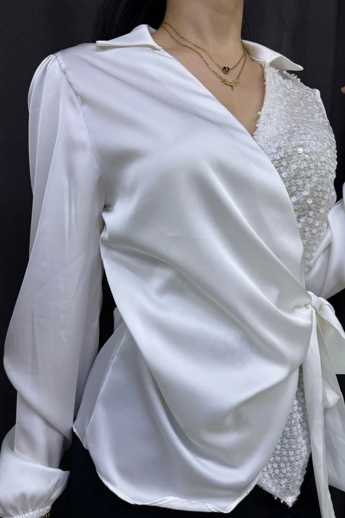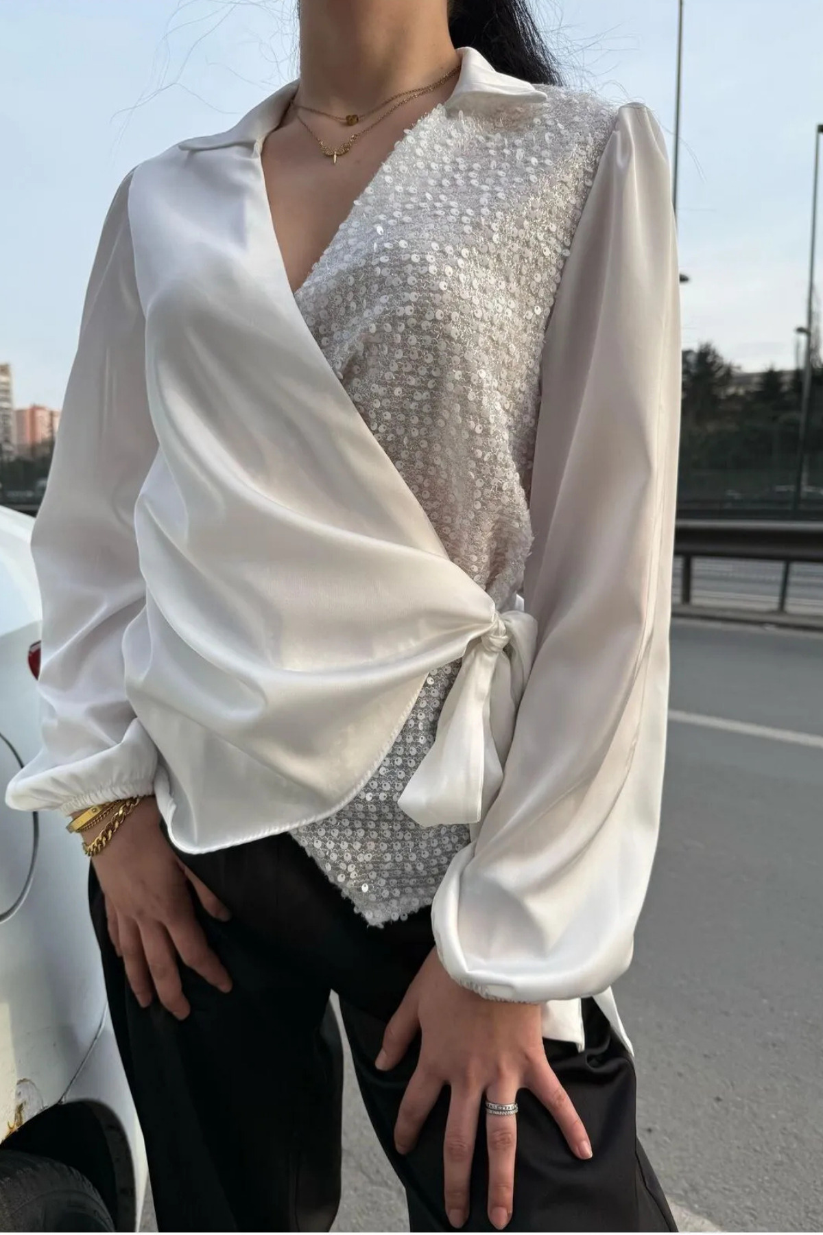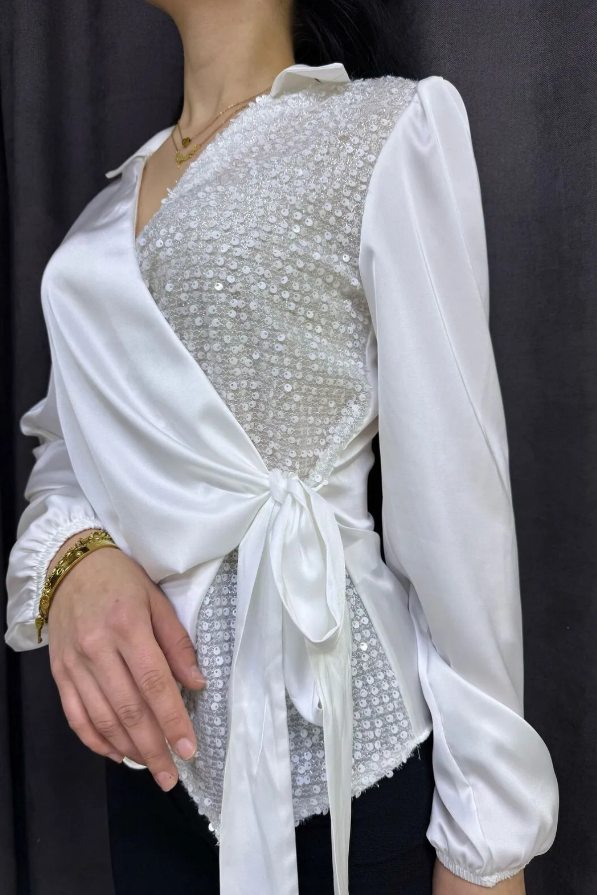 KADIN V Yaka Kolu Lastikli Yarı Payetli Yandan Bağlamalı Dar Kesim Saten Bluz KADIN V Yaka Kolu Lastikli Yarı Payetli Yandan Bağlamalı Dar Kesim Saten Bluz SUN40 46