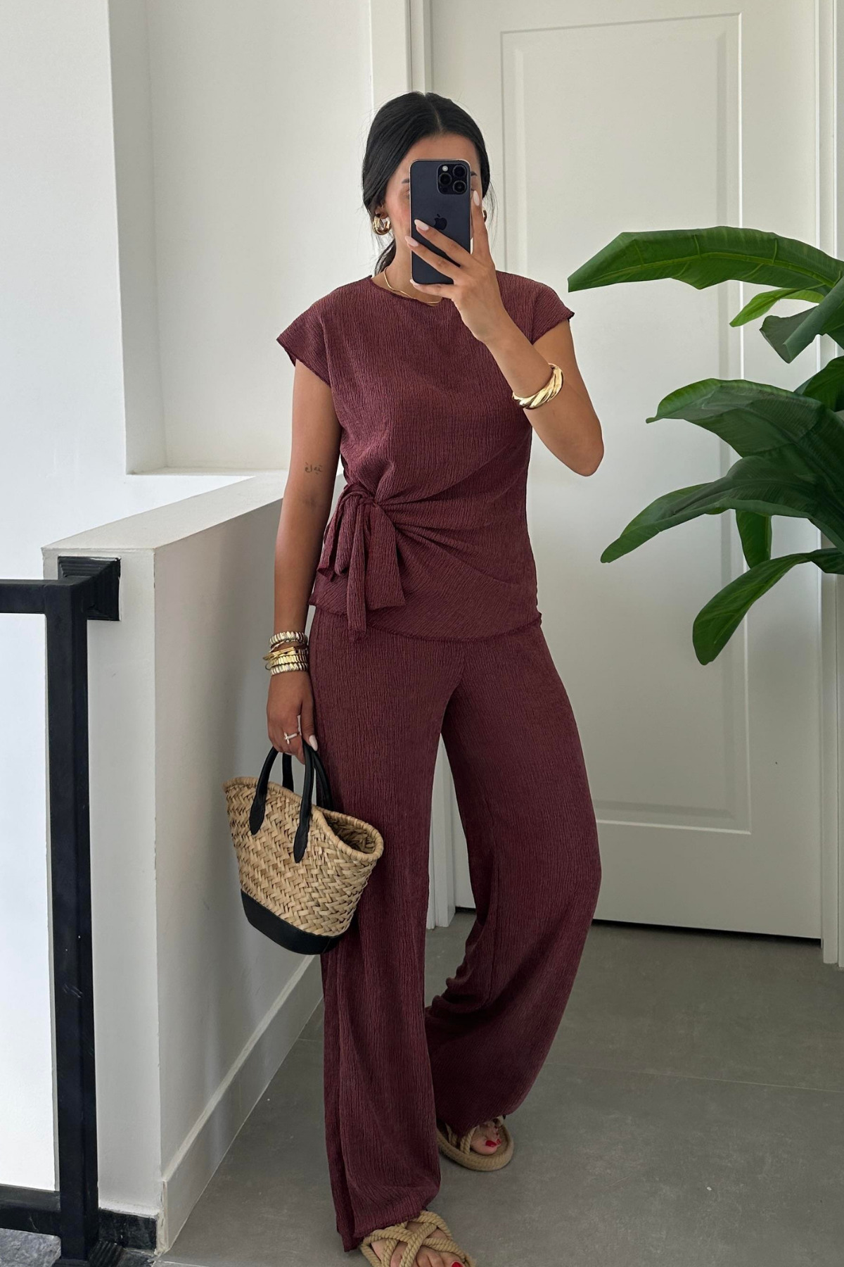 Kadın Sienna 4 Mevsim Bordo Bağlama Detaylı Krinkıl Kumaş Bluz Pantolon Takım Kadın Sienna 4 Mevsim Bordo Bağlama Detaylı Krinkıl Kumaş Bluz Pantolon Takım PWG2605251750 XL