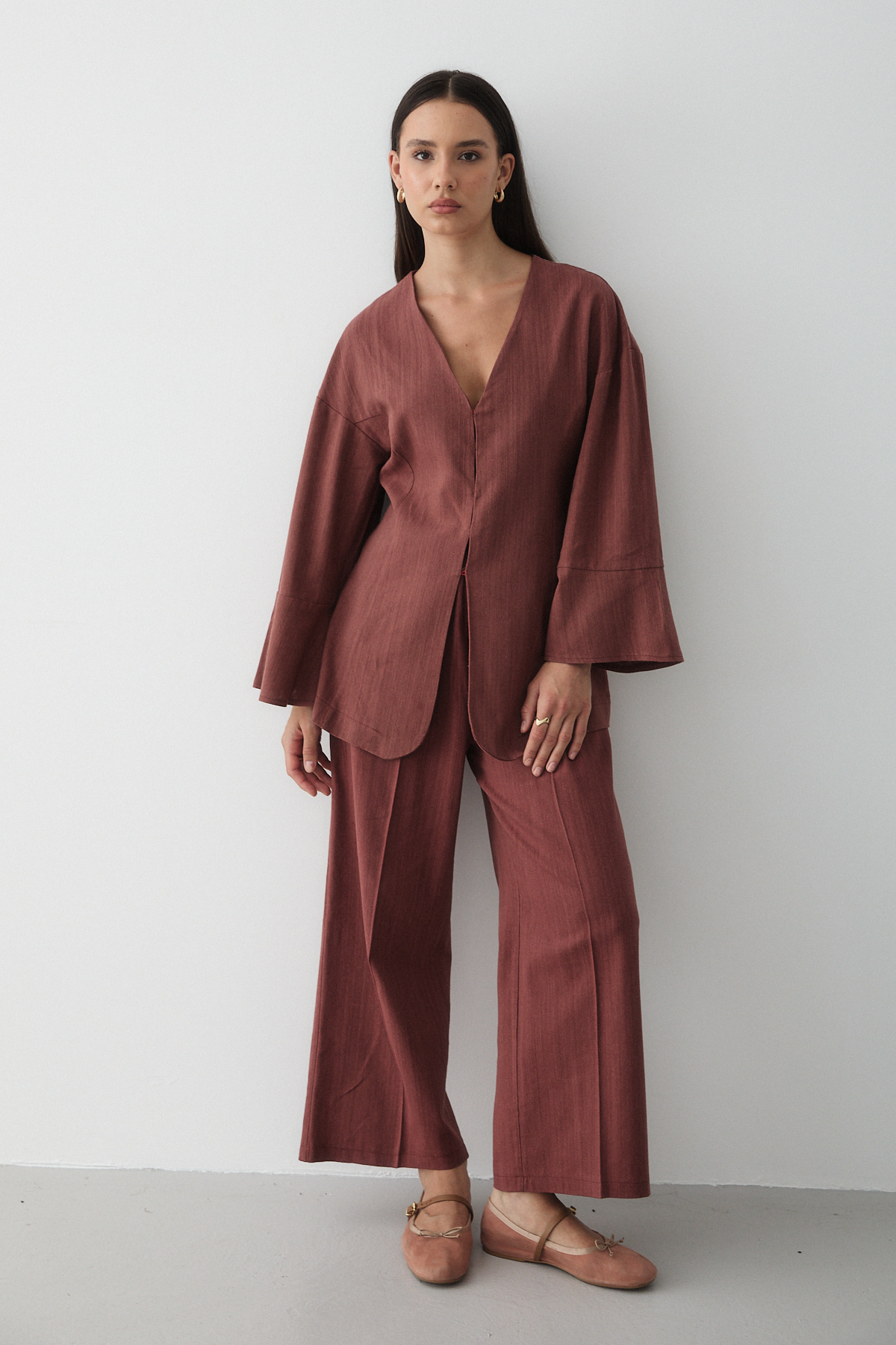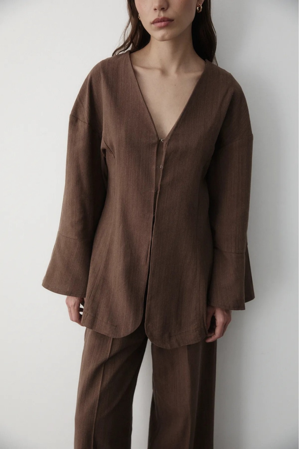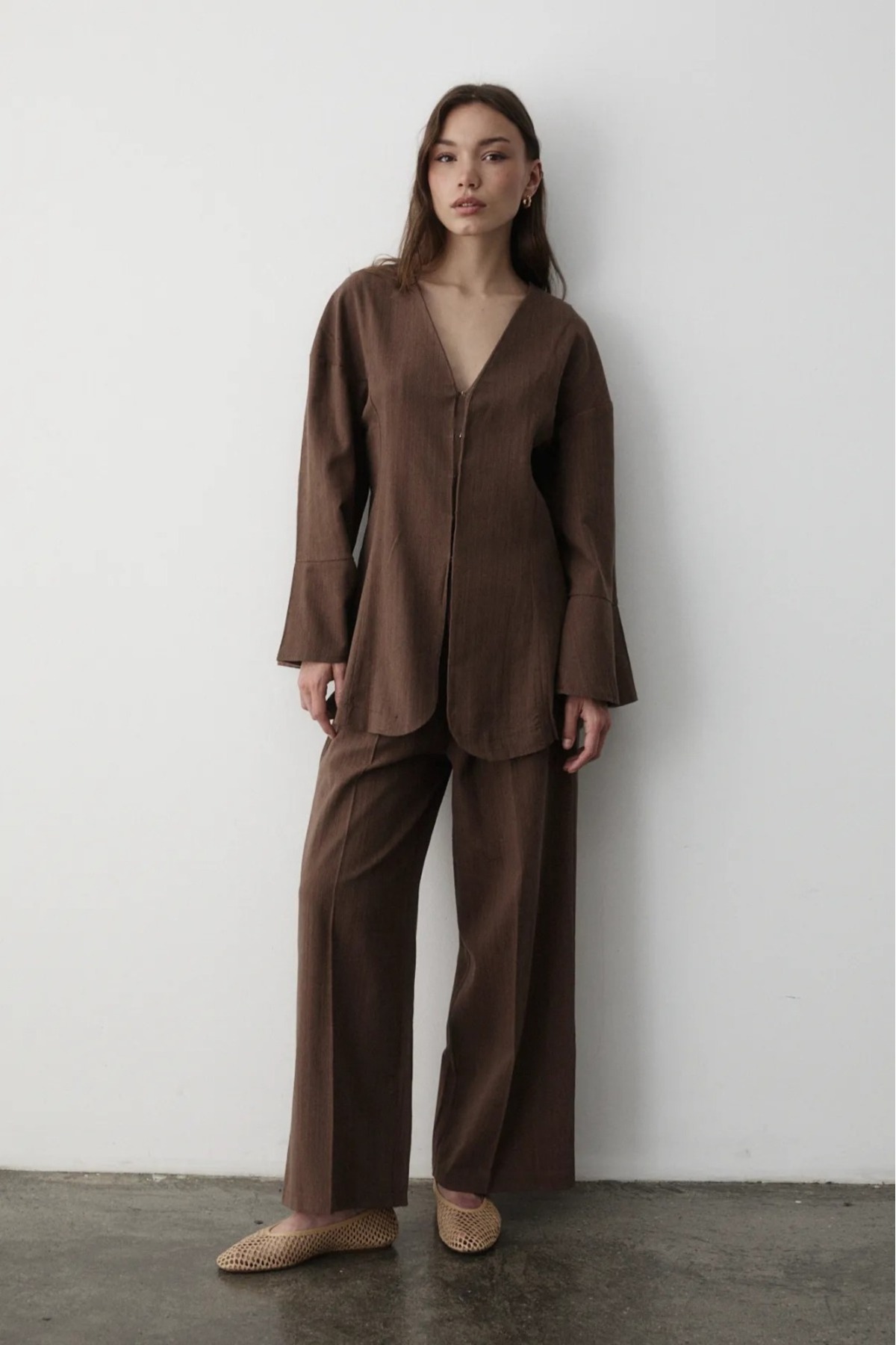 Kadın Kahverengi V Yaka Gizli Düğmeli Üst & Lastikli Pantolon Keten Alt & Üst Takım Kadın Kahverengi V Yaka Gizli Düğmeli Üst & Lastikli Pantolon Keten Alt & Üst Takım 8645 XL