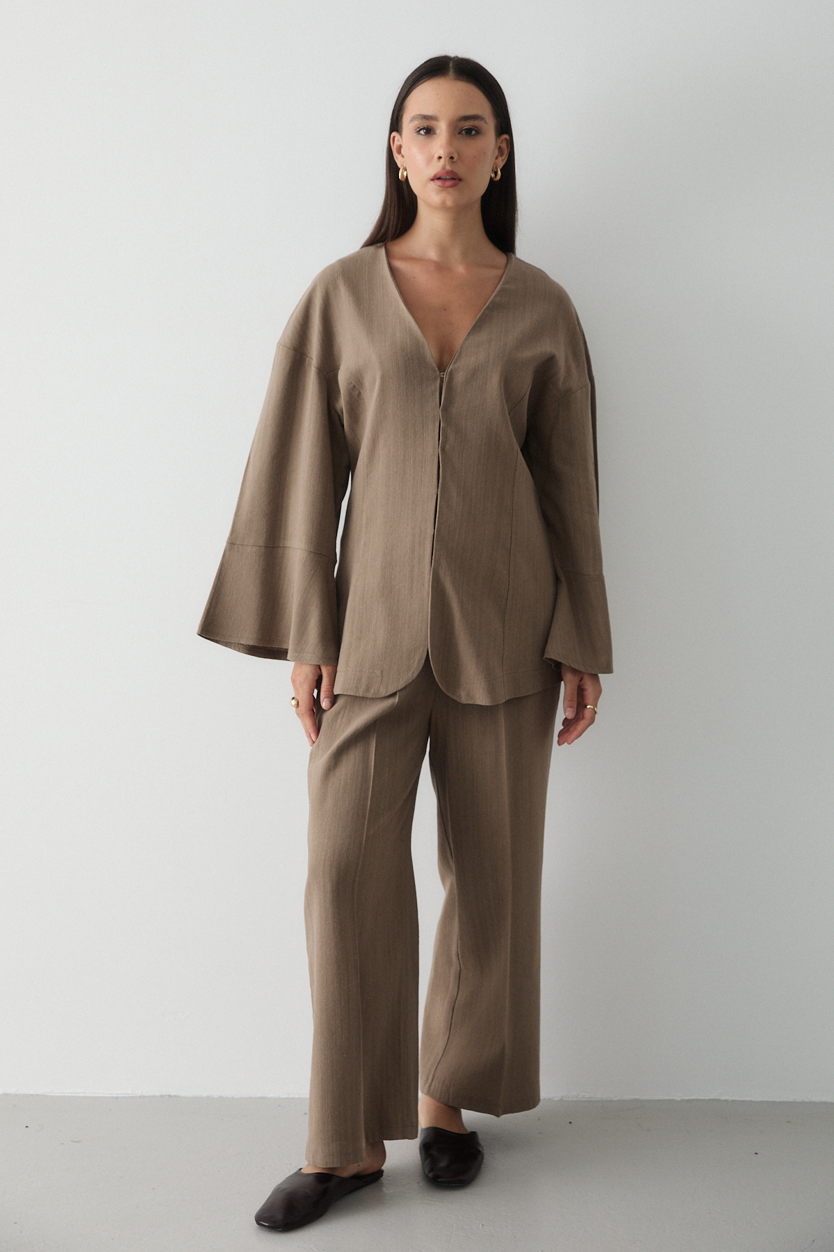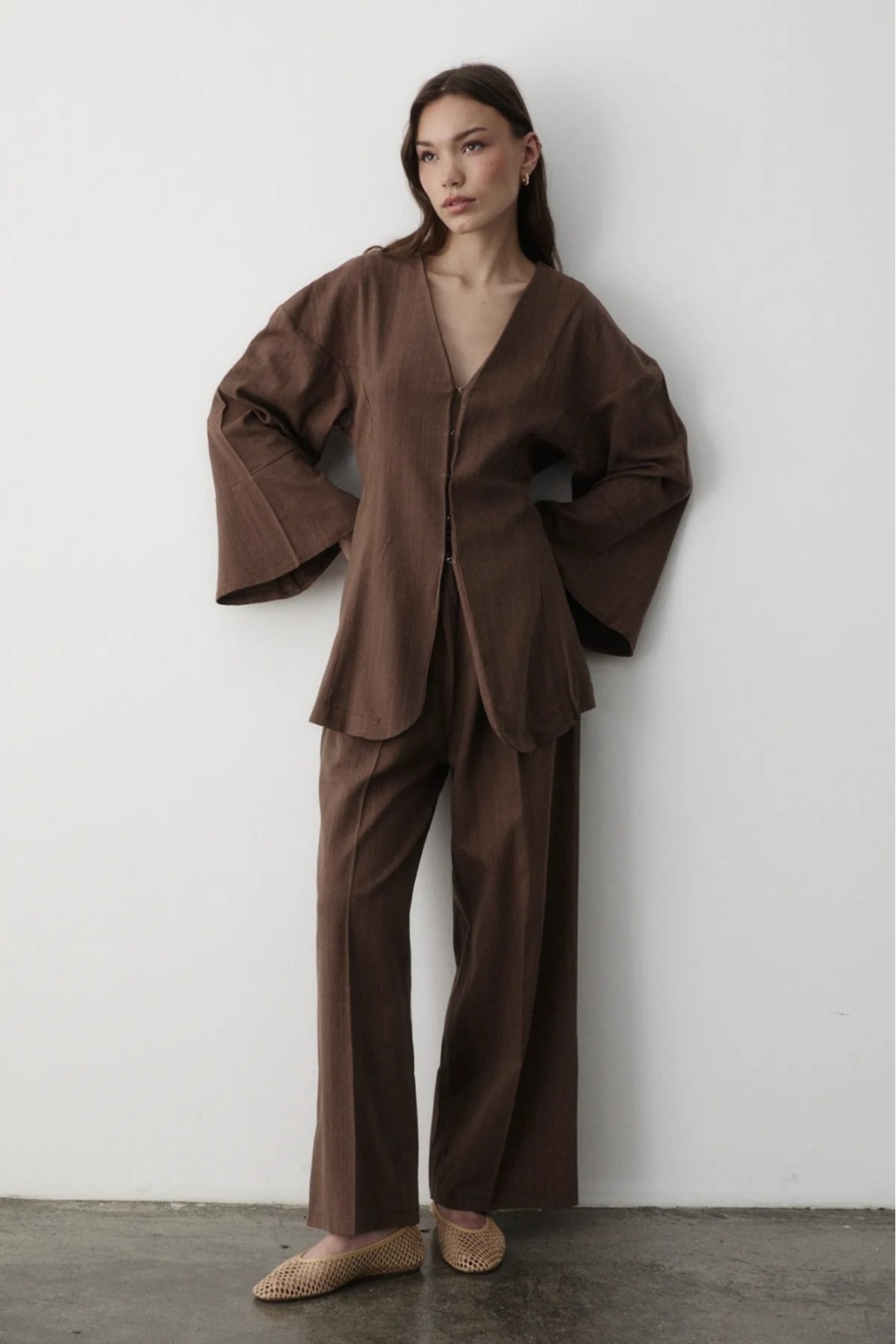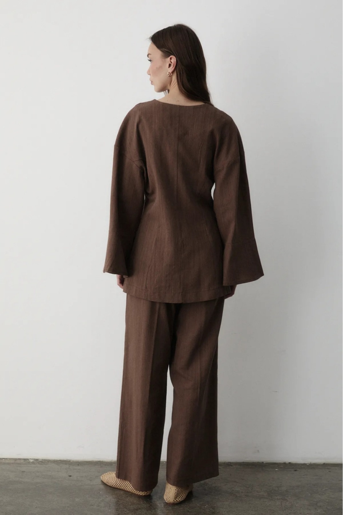 Kadın Kahverengi V Yaka Gizli Düğmeli Üst & Lastikli Pantolon Keten Alt & Üst Takım Kadın Kahverengi V Yaka Gizli Düğmeli Üst & Lastikli Pantolon Keten Alt & Üst Takım 8645 XL