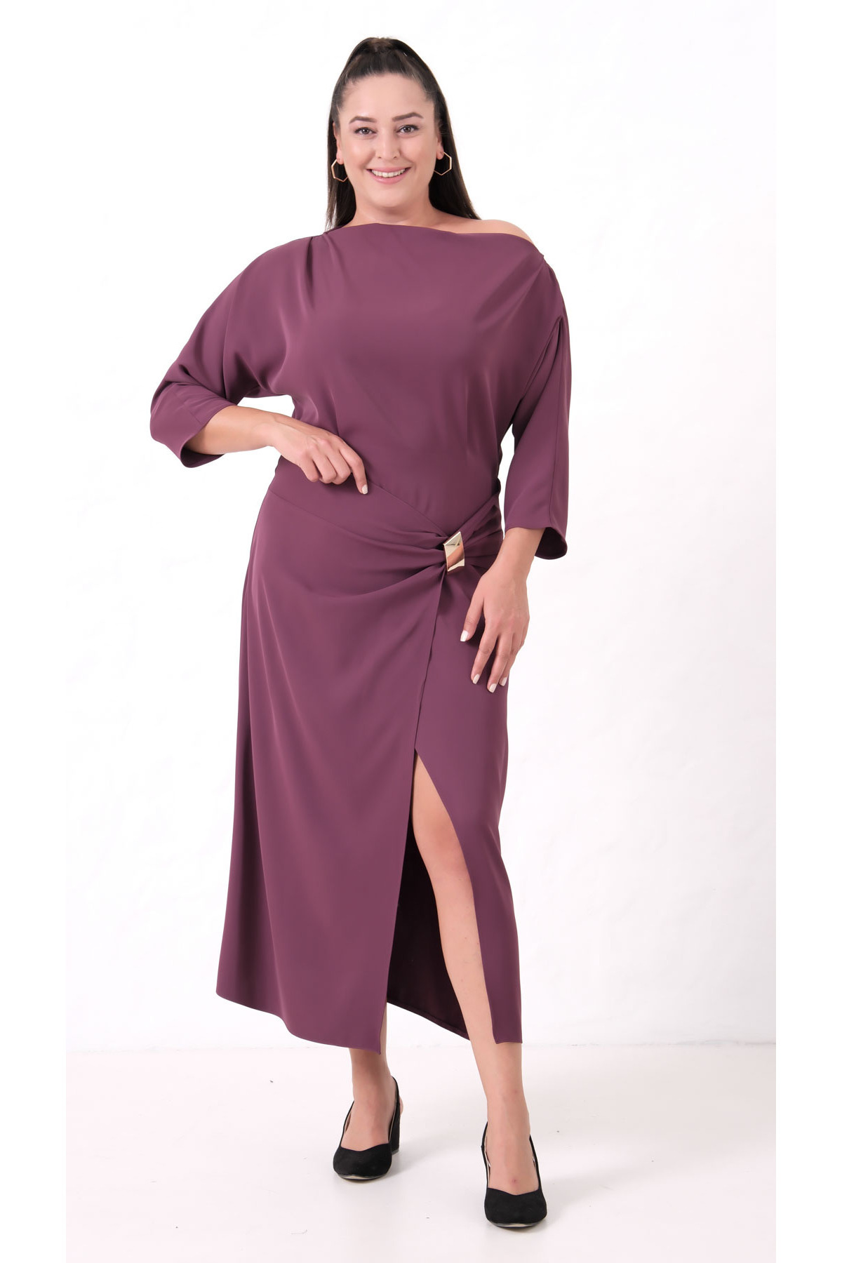 Modern Drapeli "Bordo" Beli Tokalı Midi Elbise Modern Drapeli "Bordo" Beli Tokalı Midi Elbise 3060B 48