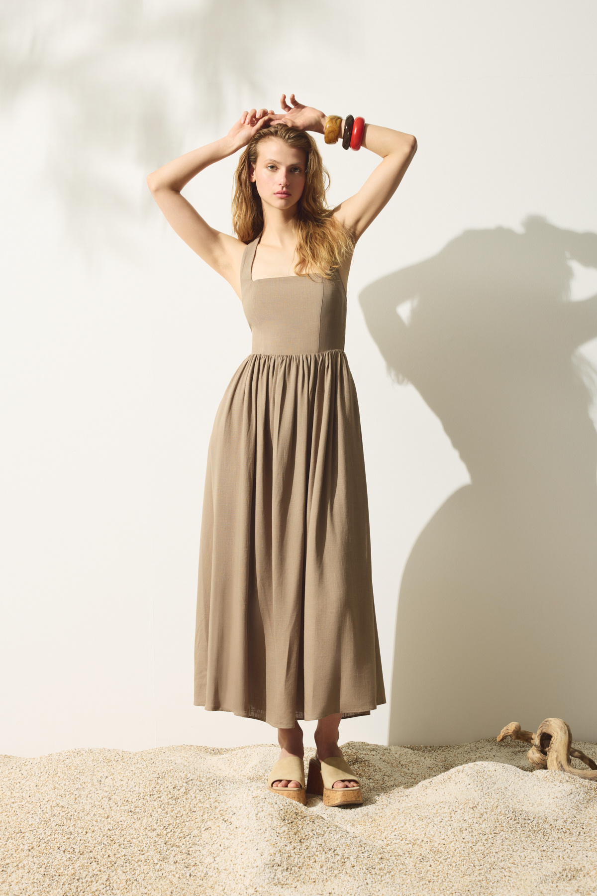 Kırışık Görünümlü Halter Yaka Uzun Elbise Bej Kırışık Görünümlü Halter Yaka Uzun Elbise Bej 25YELB00212 M