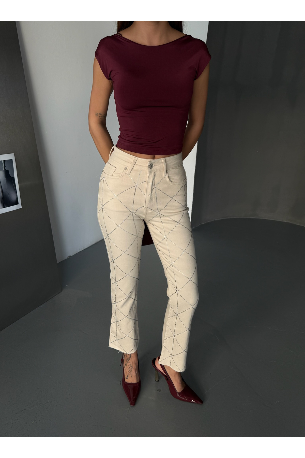 Kadın Taşlı Kesik Paça Mini Flare Yüksek Bel Jean Kadın Taşlı Kesik Paça Mini Flare Yüksek Bel Jean 395 42