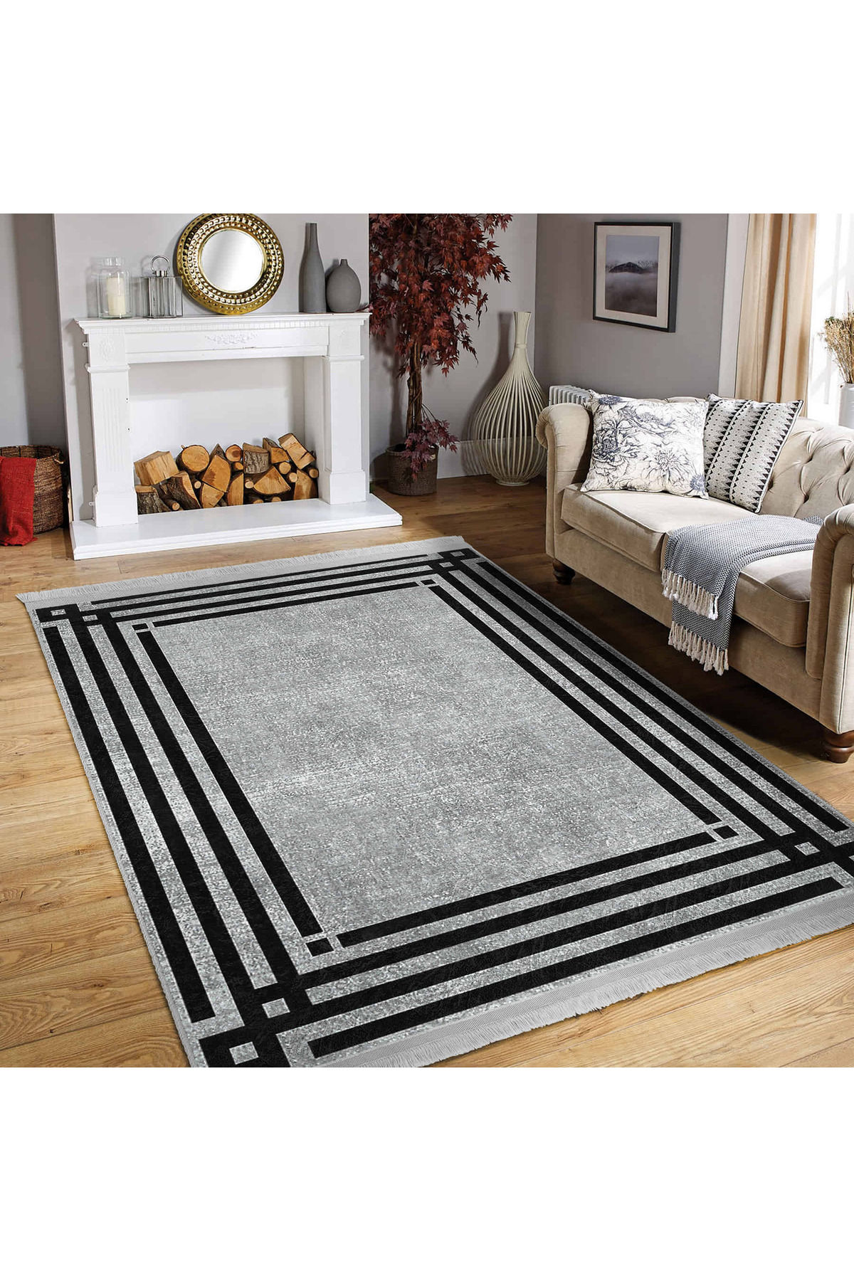 Siyah Çizgilerle Modern Desenli Dikdörtgen Yıkanabilir Kaymaz Taban Salon Halısı Siyah Çizgilerle Modern Desenli Dikdörtgen Yıkanabilir Kaymaz Taban Salon Halısı DikHali-11591 160 x 230