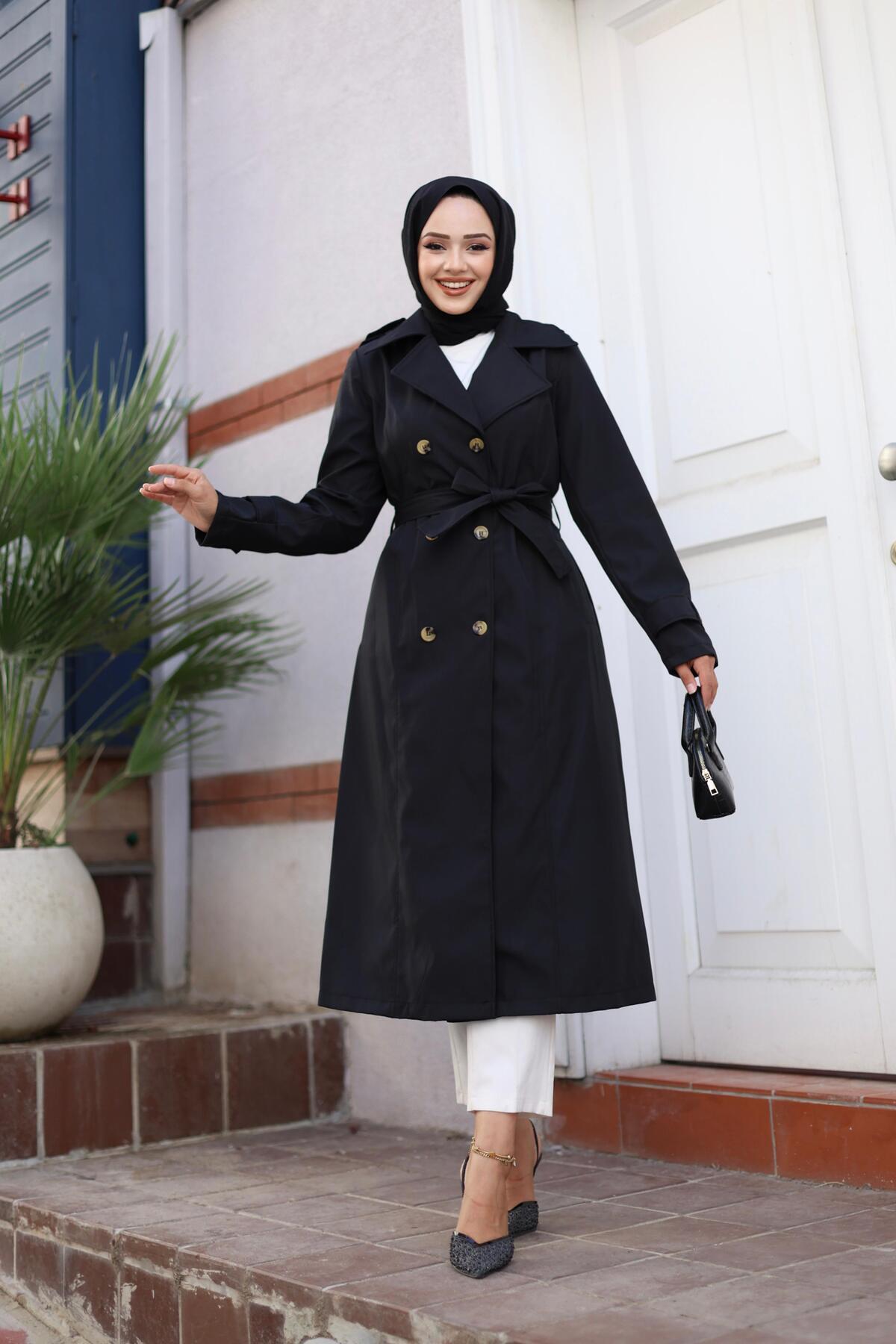 Kadın Düğmeli Kuşaklı Lacivert Trençkot Kadın Düğmeli Kuşaklı Lacivert Trençkot 1355 42