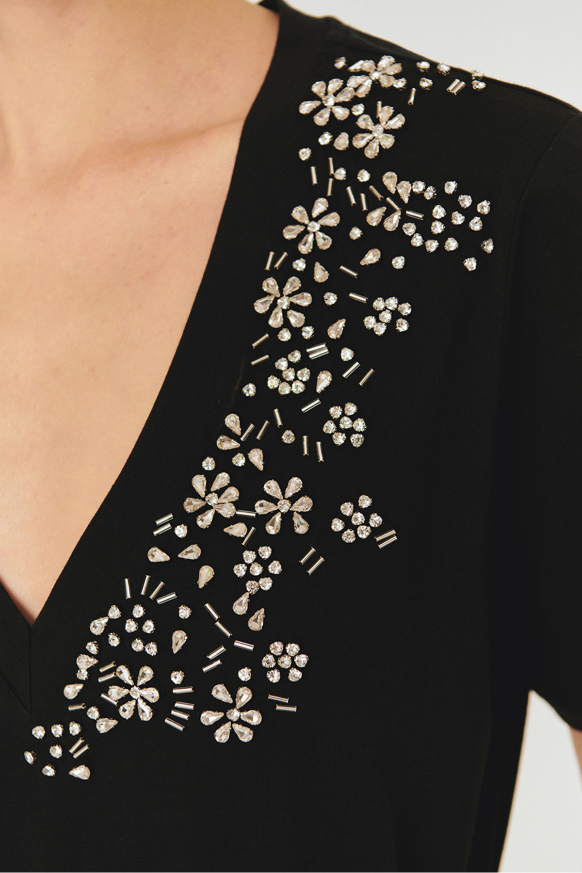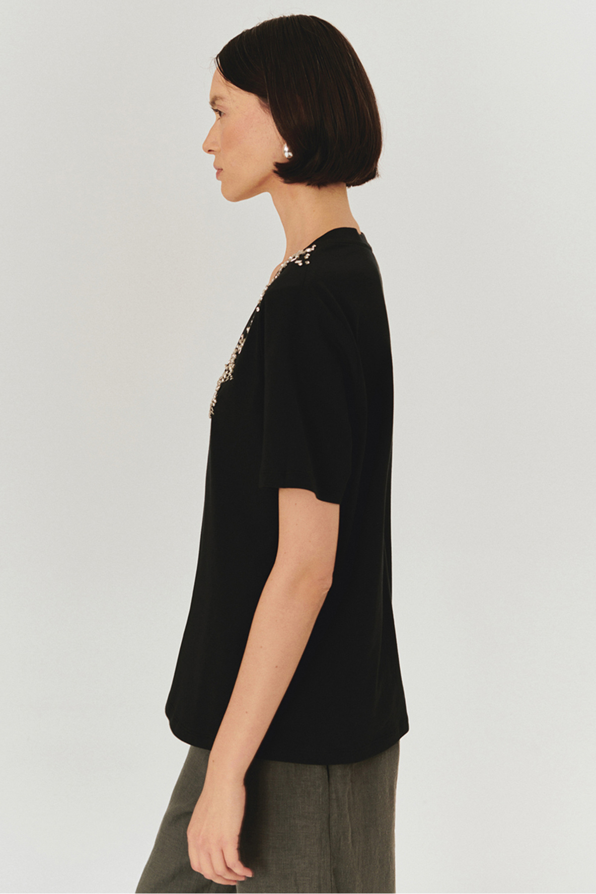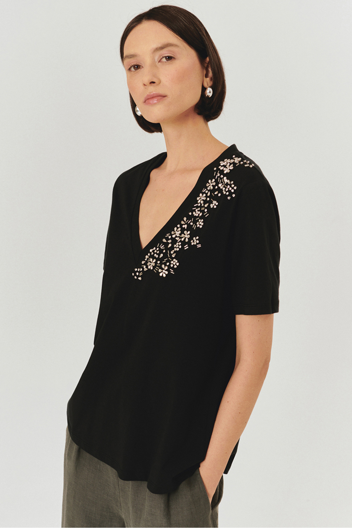 İşleme Detaylı Siyah V Yaka Pamuklu Regular Örme T-shirt İşleme Detaylı Siyah V Yaka Pamuklu Regular Örme T-shirt E25Y05273020_501_XXS XXS