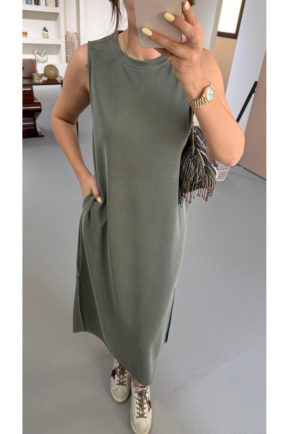 Premium Seri Kolsuz Yırtmaç Detay Haki Pike Modal Elbise Premium Seri Kolsuz Yırtmaç Detay Haki Pike Modal Elbise ELB-0682-HAKİ XL