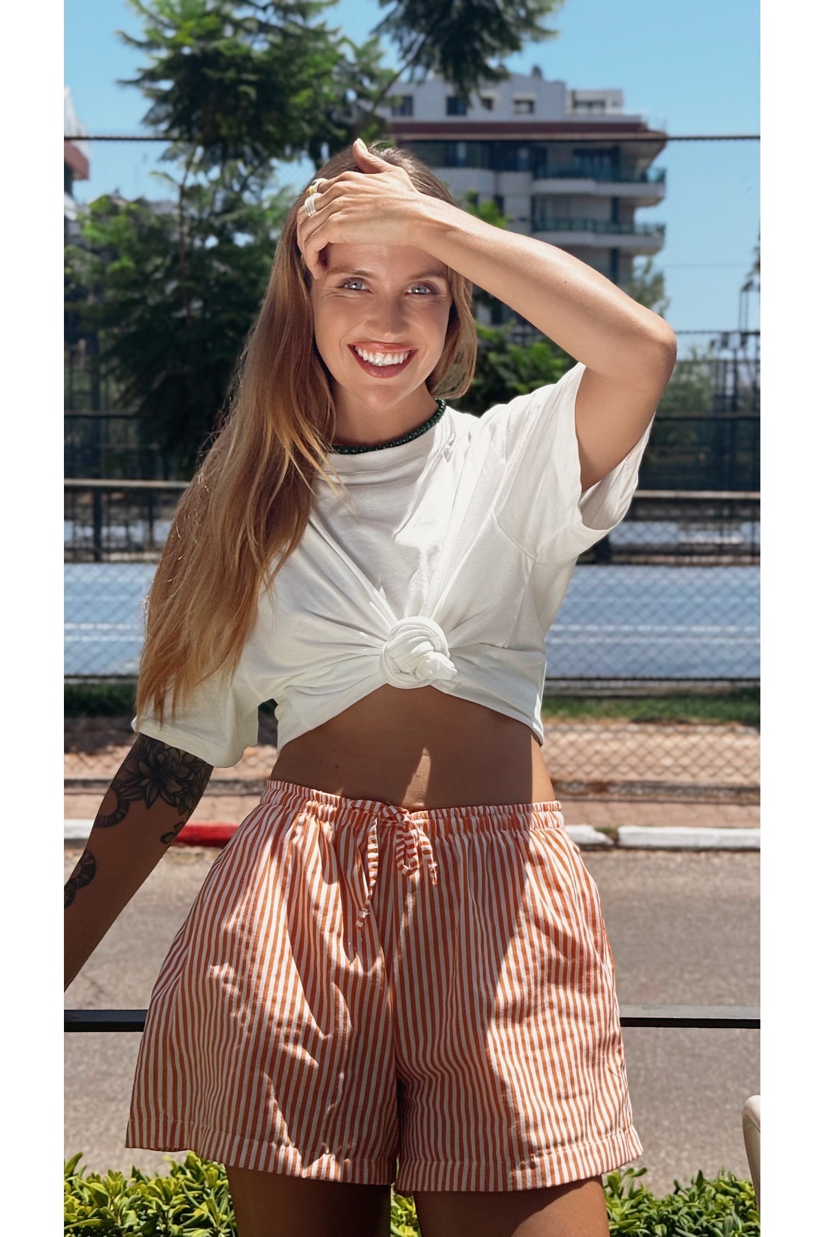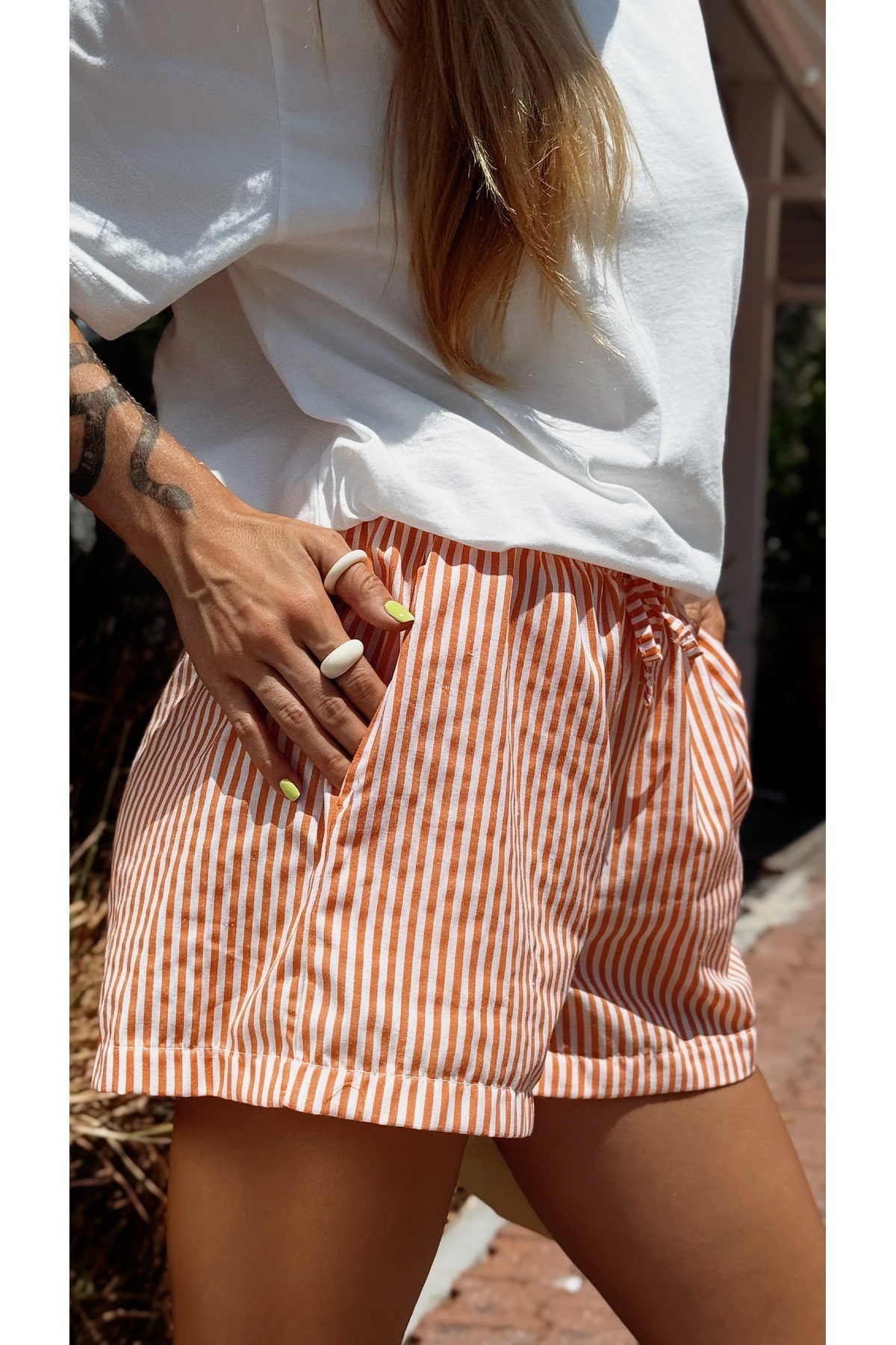 Kadın Cepli Beli Lastikli Çizgili Şort Turuncu Kadın Cepli Beli Lastikli Çizgili Şort Turuncu LS0017-01 L