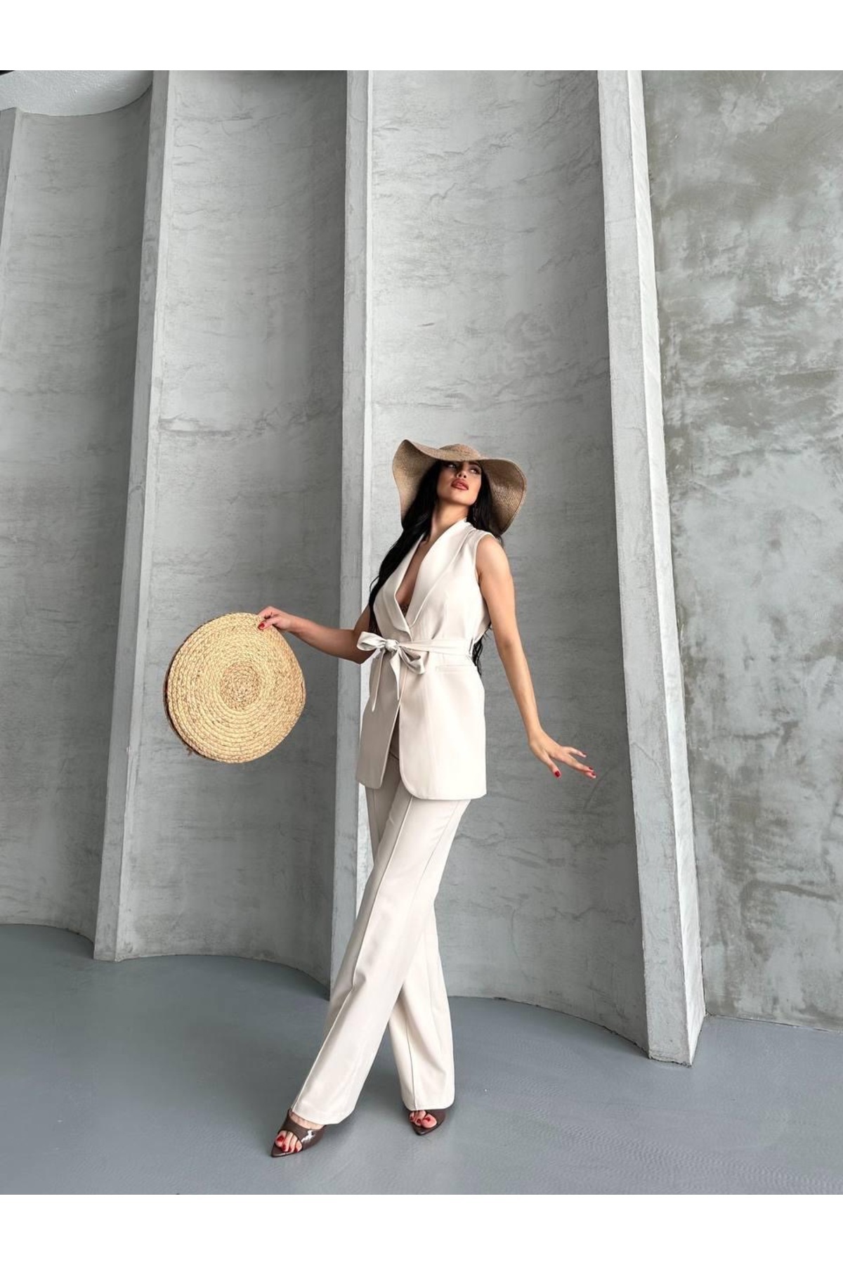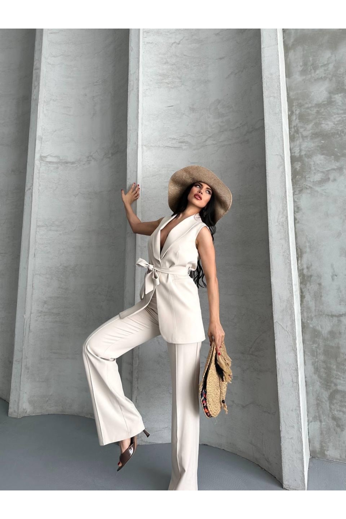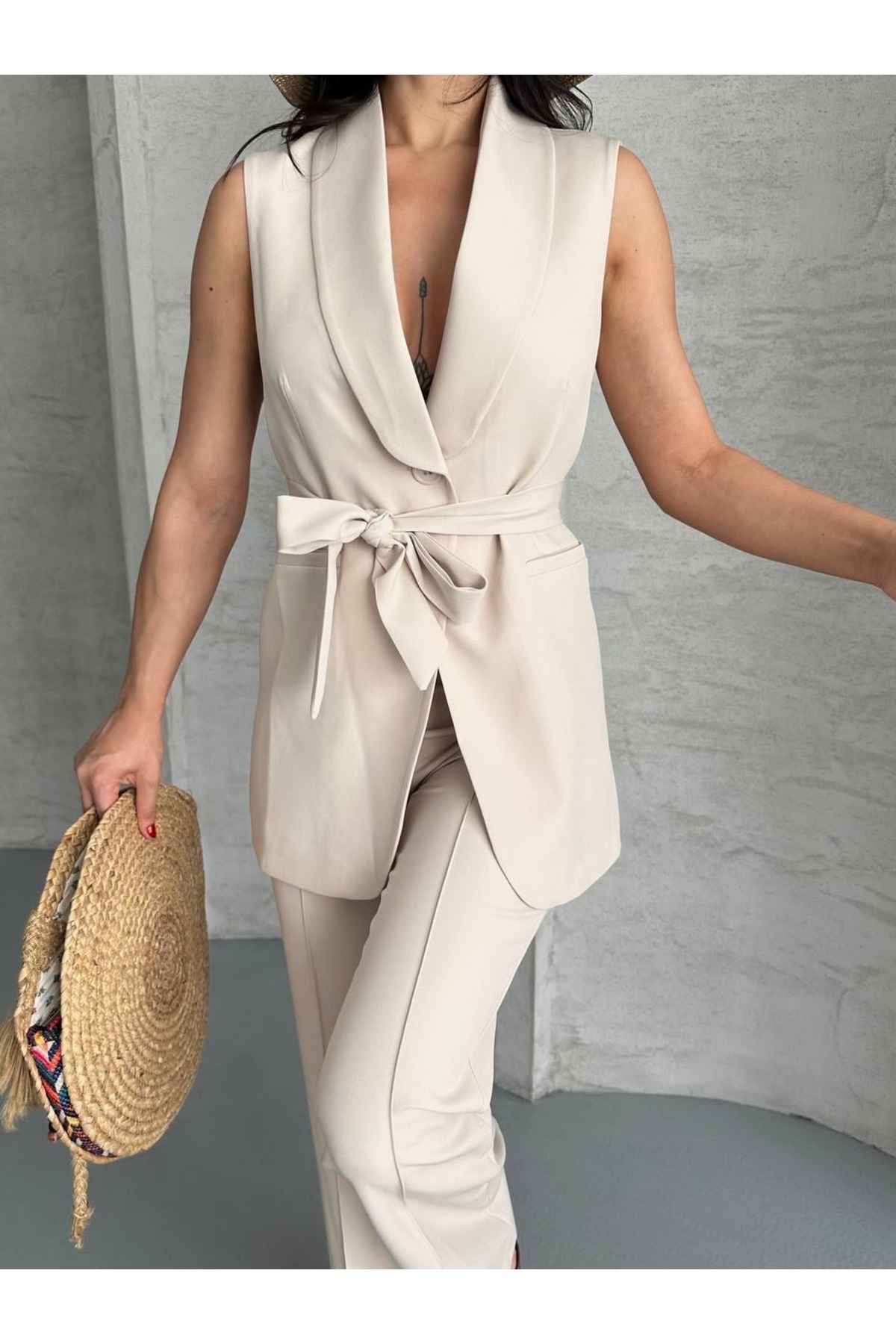 Kalın Kuşaklı Yelekli Pantolonlu İkili Blazer Takım Kalın Kuşaklı Yelekli Pantolonlu İkili Blazer Takım QB45094356 42